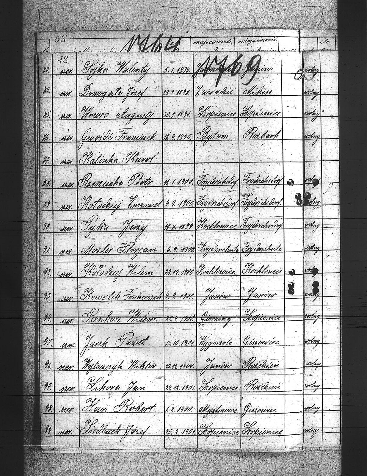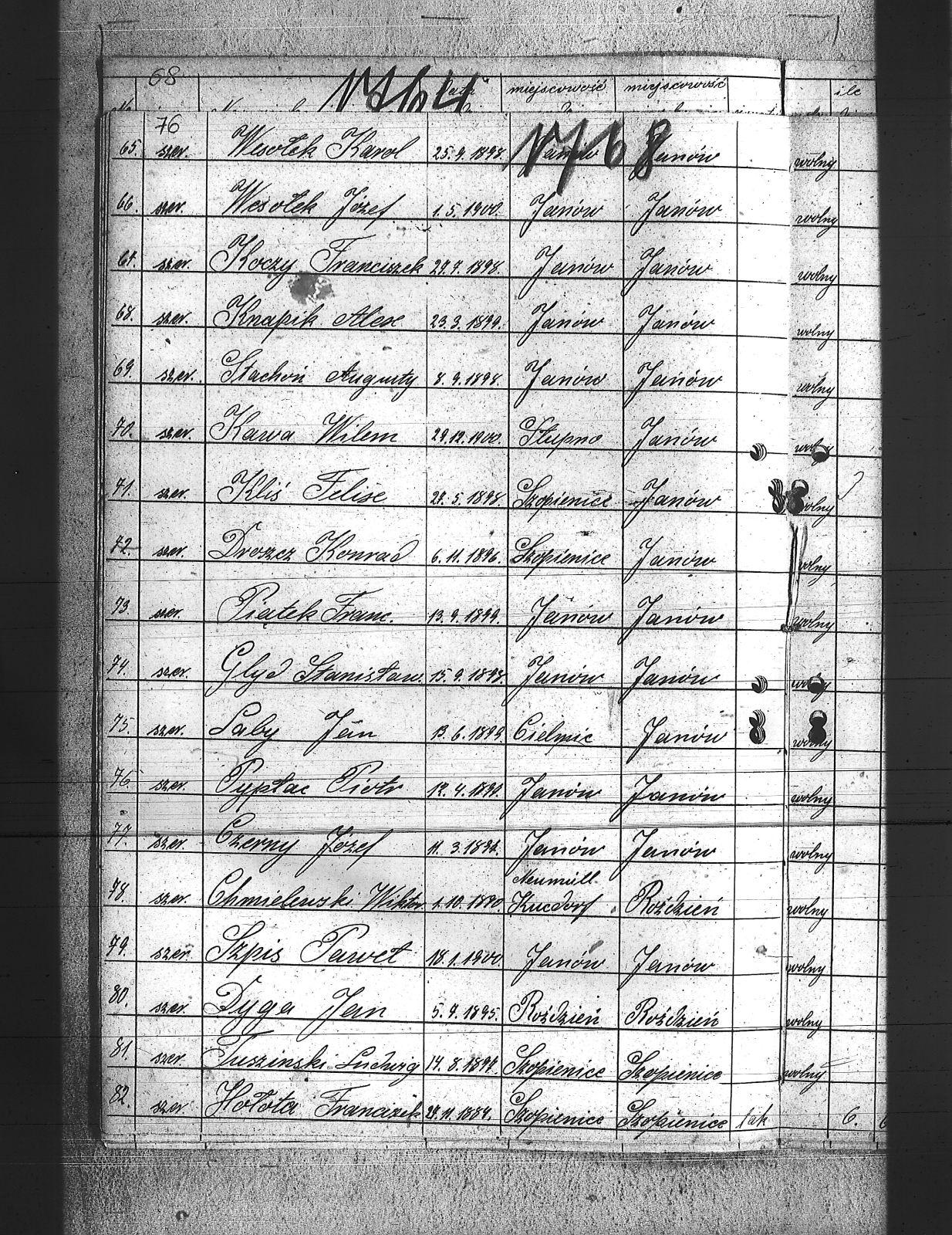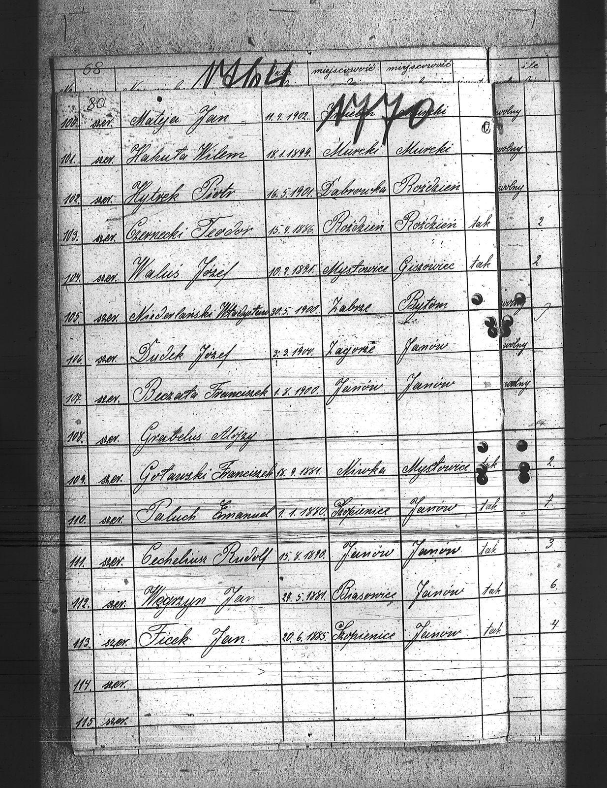 Beczata, Franciszek; Brodacki, Paweł; Burket, Wiktor; Cecheliusz, Rudolf; Chmielewski, Wiktor; Chwietarz, Józef; Cypionka, Paweł; Cypionka, Piotr; Czernecki, Teodor; Czerny, Józef; Czop, Robert; Daniel, Józef; Dlubis, Jan; Dłucik, Józef; Domogała, Józef; Dreszcz, Konrad; Dudek, Józef; Dyga, Jan; Dytko, Franciszek; Dytko, Michał; Dziadek, Alojzy; Ficek, Jan; Gabor, Józef; Gabor, Ludwig; Gaszczyk, Józef; Gawlica, Franciszek; Gil, Jan; Glyd, Stanisław; Gotawski, Franciszek; Grabelus, Alojzy; Gros, Józef; Grudniok, Piotr; Gruszka, Paweł; Gryc, Edmund; Gulda, Paweł; Gwóźdź, Franciszek; Hahuta, Wilem; Han, Robert; Hering, Jan; Hołota, Franciszek; Hołota, Paweł; Hołota, Wiktor; Howaniec, Władysław; Hytrek, Piotr; Jarek, Paweł; Kalinka, Karol; Kawa, Wilem; Kędziorczyk, Augustyn; Kimel, Wincenty; Klich, Franciszek; Kliś, Felise; Knapik, Alex; Knapik, Teodor; Koczur, Teofil; Koczy, Franciszek; Kołodziej, Emanuel; Kołodziej, Wilem; Kołodziejczyk, Antoni; Korczyk, Jan; Korczyk, Ludwig; Koruki, Konrad; Kostka, Tomasz; Kowolik, Franciszek; Ksiądz, Paweł; Kubica, Józef; Kubica, Tomasz; Kula, Jakób; Laby, Jan; Latocha, Franciszek; Maślorz, Clemens; Mateja, Antoni; Mateja, Jan; Materna, Ryszard; Michnol, Teodor; Michnol, Walenty; Molenda, Edward; Mozler, Florjan; Mucek, Paweł; Musioł, Paweł; Mutki, Karol; Myndera, Jan; Niederlański, Władysław; Nowok, Antoni; Nowok, Emil; Nowok, Tomasz; Paljon, Piotr; Paluch, Emanuel; Piątek, Franciszek; Piguła, Franciszek; Pyka, Jerzy; Pyptac, Piotr; Rak, Ludwig; Renkosz, Wilem; Roj, Augustyn; Roj, Jakub; Roter, Antoni; Rzerzucha, Piotr; Siedlacek, Józef; Sieracki, Wilhelm; Sikora, Jan; Siodło, Franciszek; Sitko, Augustyn; Siwy, Szczepan; Słota, Józef; Słota, Paweł; Sojka, Herman; Sojka, Walenty; Sołtysiek, Szczepan; Sorek, Paweł; Sorek, Wilhelm; Stachoń, Augusty; Stecz, Wilhelm; Stolorz, Wojciech; Strzelczyk, Wincenty; Szczok, Konrad; Szczok, Paweł; Szdot, Paweł; Szedzisko, Jan; Szeja, Szymon; Szewczyk, Marek; Szlosarek, Teodor; Szpis, Paweł; Szulc, Jan; Targiel, Tomasz; Tuszinski, Ludwig; Uliczka, Józef; Ulman, Franciszek; Waluś, Józef; Waruus, Ludwik; Warwas, Tomasz; Wesołek, Józef; Wesołek, Karol; Węgrzyn, Jan; Wileczek, Wojciech; Władacz, Karol; Wojtaszczyk, Wiktor; Wojtyczka, Augustyn; Wowro, Augusty; Wrona, Stanisław; Wybraniec, Paweł; Zagracki, Franciszek; Zając, Józef; Zając, Szczepan; Zięba, Jan; |