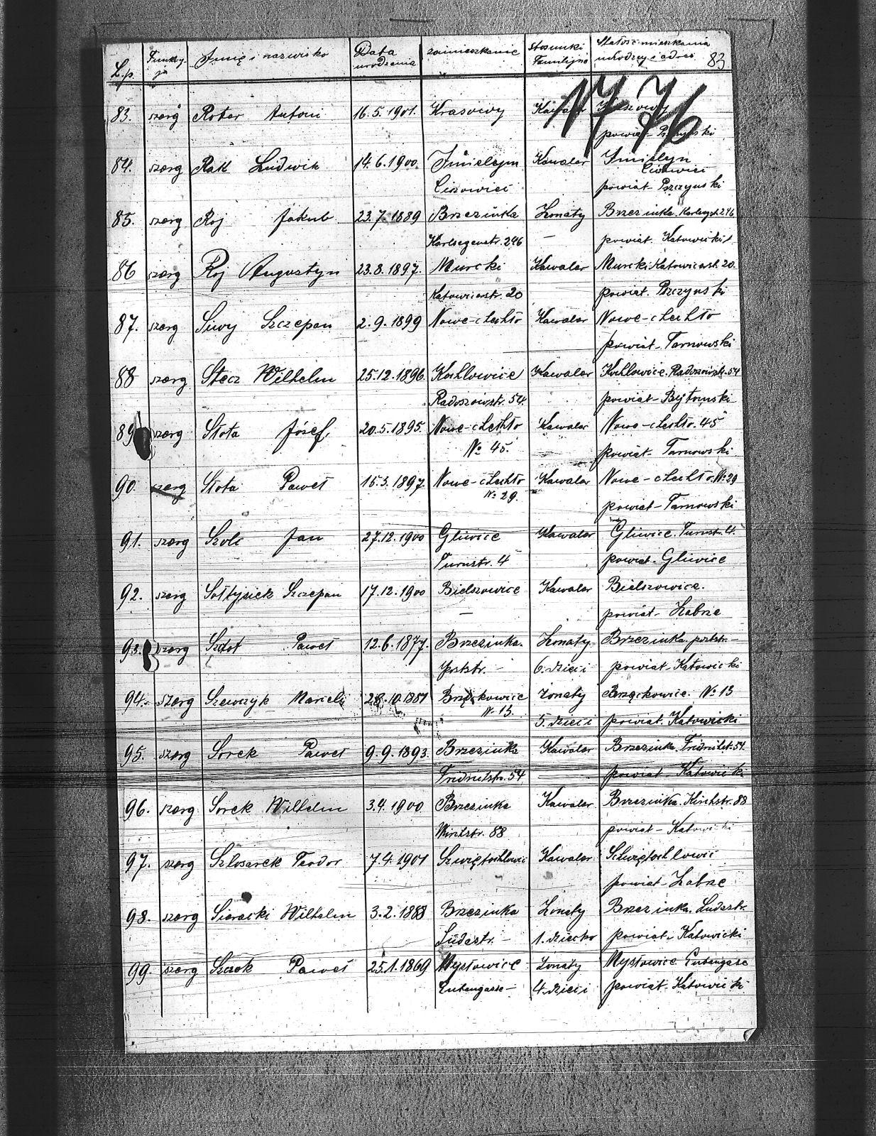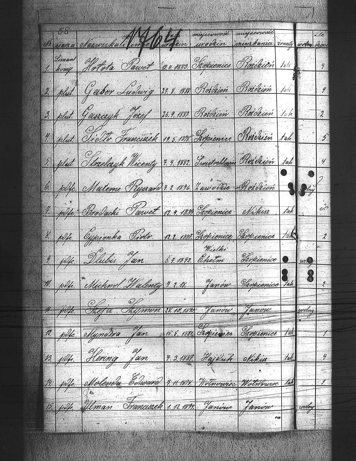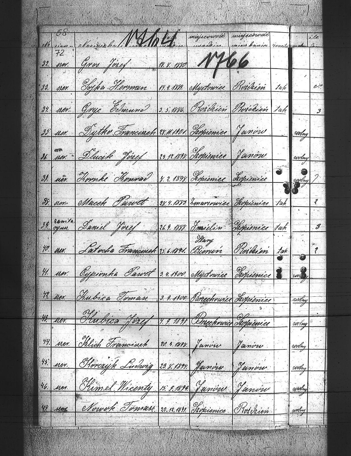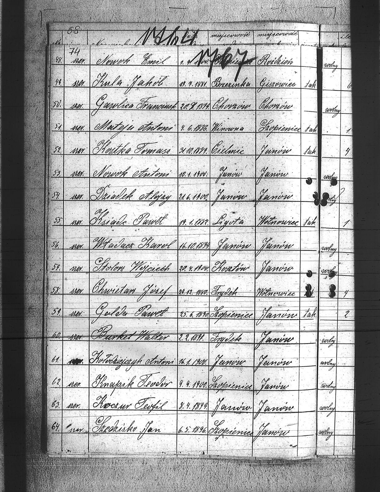 Beczata, Franciszek; Brodacki, Paweł; Burket, Wiktor; Cecheliusz, Rudolf; Chmielewski, Wiktor; Chwietarz, Józef; Cypionka, Paweł; Cypionka, Piotr; Czernecki, Teodor; Czerny, Józef; Czop, Robert; Daniel, Józef; Dlubis, Jan; Dłucik, Józef; Domogała, Józef; Dreszcz, Konrad; Dudek, Józef; Dyga, Jan; Dytko, Franciszek; Dytko, Michał; Dziadek, Alojzy; Ficek, Jan; Gabor, Józef; Gabor, Ludwig; Gaszczyk, Józef; Gawlica, Franciszek; Gil, Jan; Glyd, Stanisław; Gotawski, Franciszek; Grabelus, Alojzy; Gros, Józef; Grudniok, Piotr; Gruszka, Paweł; Gryc, Edmund; Gulda, Paweł; Gwóźdź, Franciszek; Hahuta, Wilem; Han, Robert; Hering, Jan; Hołota, Franciszek; Hołota, Paweł; Hołota, Wiktor; Howaniec, Władysław; Hytrek, Piotr; Jarek, Paweł; Kalinka, Karol; Kawa, Wilem; Kędziorczyk, Augustyn; Kimel, Wincenty; Klich, Franciszek; Kliś, Felise; Knapik, Alex; Knapik, Teodor; Koczur, Teofil; Koczy, Franciszek; Kołodziej, Emanuel; Kołodziej, Wilem; Kołodziejczyk, Antoni; Korczyk, Jan; Korczyk, Ludwig; Koruki, Konrad; Kostka, Tomasz; Kowolik, Franciszek; Ksiądz, Paweł; Kubica, Józef; Kubica, Tomasz; Kula, Jakób; Laby, Jan; Latocha, Franciszek; Maślorz, Clemens; Mateja, Antoni; Mateja, Jan; Materna, Ryszard; Michnol, Teodor; Michnol, Walenty; Molenda, Edward; Mozler, Florjan; Mucek, Paweł; Musioł, Paweł; Mutki, Karol; Myndera, Jan; Niederlański, Władysław; Nowok, Antoni; Nowok, Emil; Nowok, Tomasz; Paljon, Piotr; Paluch, Emanuel; Piątek, Franciszek; Piguła, Franciszek; Pyka, Jerzy; Pyptac, Piotr; Rak, Ludwig; Renkosz, Wilem; Roj, Augustyn; Roj, Jakub; Roter, Antoni; Rzerzucha, Piotr; Siedlacek, Józef; Sieracki, Wilhelm; Sikora, Jan; Siodło, Franciszek; Sitko, Augustyn; Siwy, Szczepan; Słota, Józef; Słota, Paweł; Sojka, Herman; Sojka, Walenty; Sołtysiek, Szczepan; Sorek, Paweł; Sorek, Wilhelm; Stachoń, Augusty; Stecz, Wilhelm; Stolorz, Wojciech; Strzelczyk, Wincenty; Szczok, Konrad; Szczok, Paweł; Szdot, Paweł; Szedzisko, Jan; Szeja, Szymon; Szewczyk, Marek; Szlosarek, Teodor; Szpis, Paweł; Szulc, Jan; Targiel, Tomasz; Tuszinski, Ludwig; Uliczka, Józef; Ulman, Franciszek; Waluś, Józef; Waruus, Ludwik; Warwas, Tomasz; Wesołek, Józef; Wesołek, Karol; Węgrzyn, Jan; Wileczek, Wojciech; Władacz, Karol; Wojtaszczyk, Wiktor; Wojtyczka, Augustyn; Wowro, Augusty; Wrona, Stanisław; Wybraniec, Paweł; Zagracki, Franciszek; Zając, Józef; Zając, Szczepan; Zięba, Jan; |