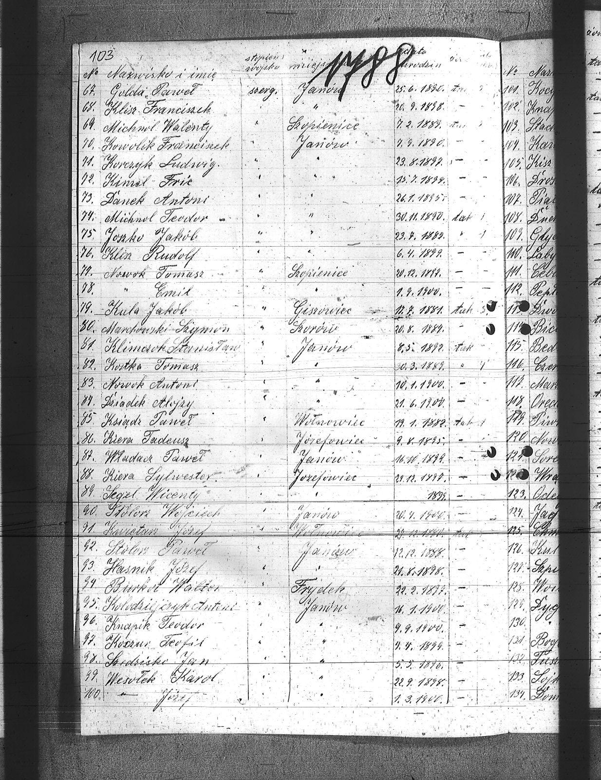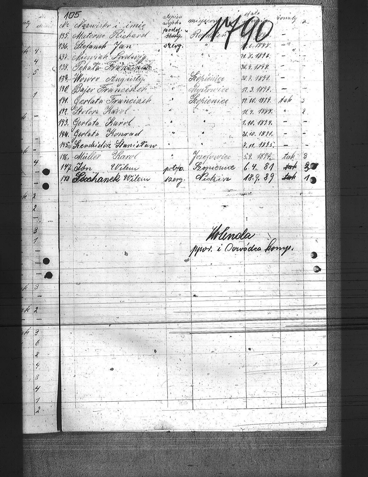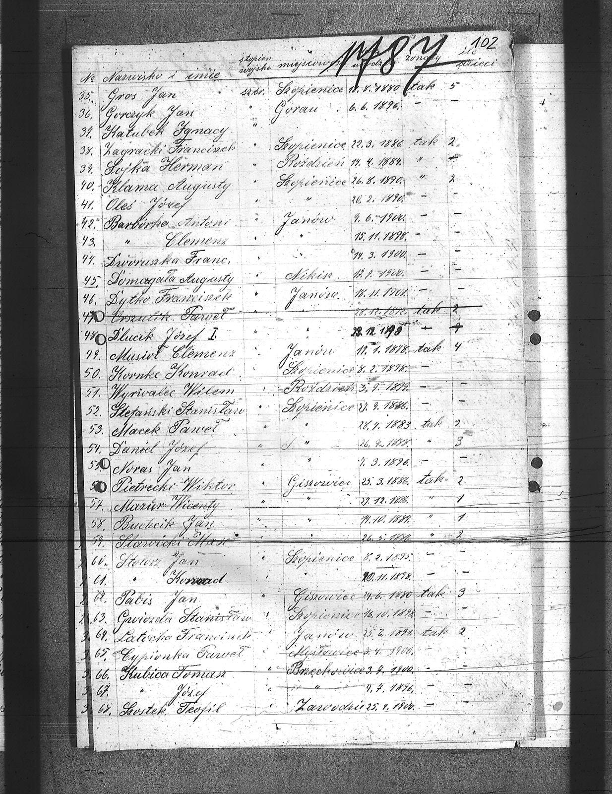 Macek, Paweł; Manowski, Antoni; Marchowski, Szymon; Marzec, Karol; Maślorz, Klemens; Materna, Richard; Mazur, Wincenty; Michnol, Teodor; Michnol, Walenty; Molęda, Edward; Muller, Karol; Musioł, Klemens; Mutke, Paweł; Myndera, Jan; Nawrot, Jan; Niewiak, Ludwig; Noras, Jan; Nowok, Antoni; Nowok, Emil; Nowok, Tomasz; Odelga, Jan; Oleś, Józef; Oredosz, Leopold; Paljon, Piotr; Patis, Jan; Pekała, Franciszek; Pepłac, Piotr; Piątek, Franciszek; Pietrecki, Wiktor; Piguła, Franciszek; Piwko, Antoni; Segel, Wincenty; Sidło, Franciszek; Sitko, Augusty; Sojka, Herman; Sojka, Walenty; Sorek, Paweł; Stachoń, Augusty; Stawicki, Maksymilian; Stefanek, Jan; Stefański, Stanisław; Stobor, Paweł; Stolorz, Jan; Stolorz, Karol; Stolorz, Konrad; Stolorz, Wojciech; Szczelczyk, Wincenty; Szeja, Szymon; Szendzielorz, Stanisław; Szidziski, Jan; Szochanek, Wilem; Szostek, Teofil; Szpis, Paweł; Tusziński, Ludwig; Ulman, Franciszek; Urszulik, Paweł; Wesołek, Józef; Wesołek, Karol; Władacz, Paweł; Woisk, Stanisław; Wowro, Augustyn; Wraski, Wiktor; Wyrwalec, Wilem; Zagracki, Franciszek; |