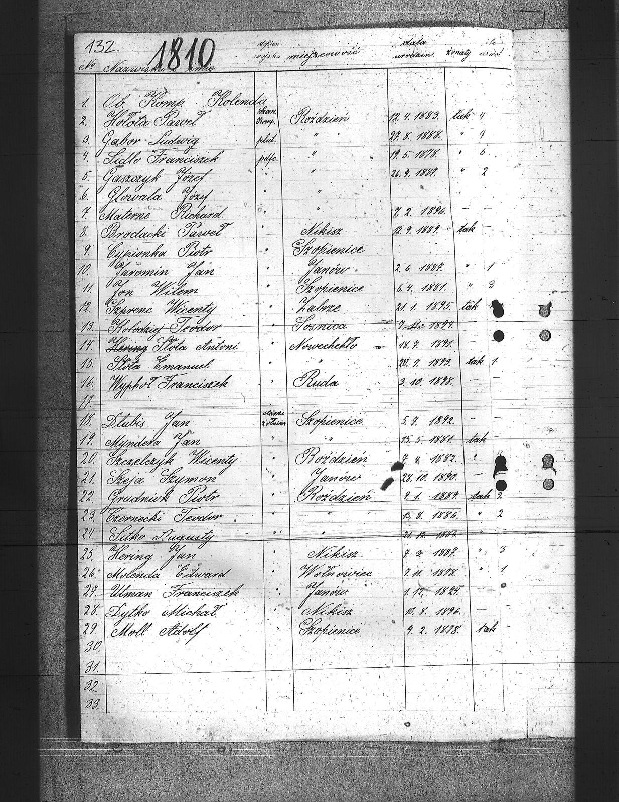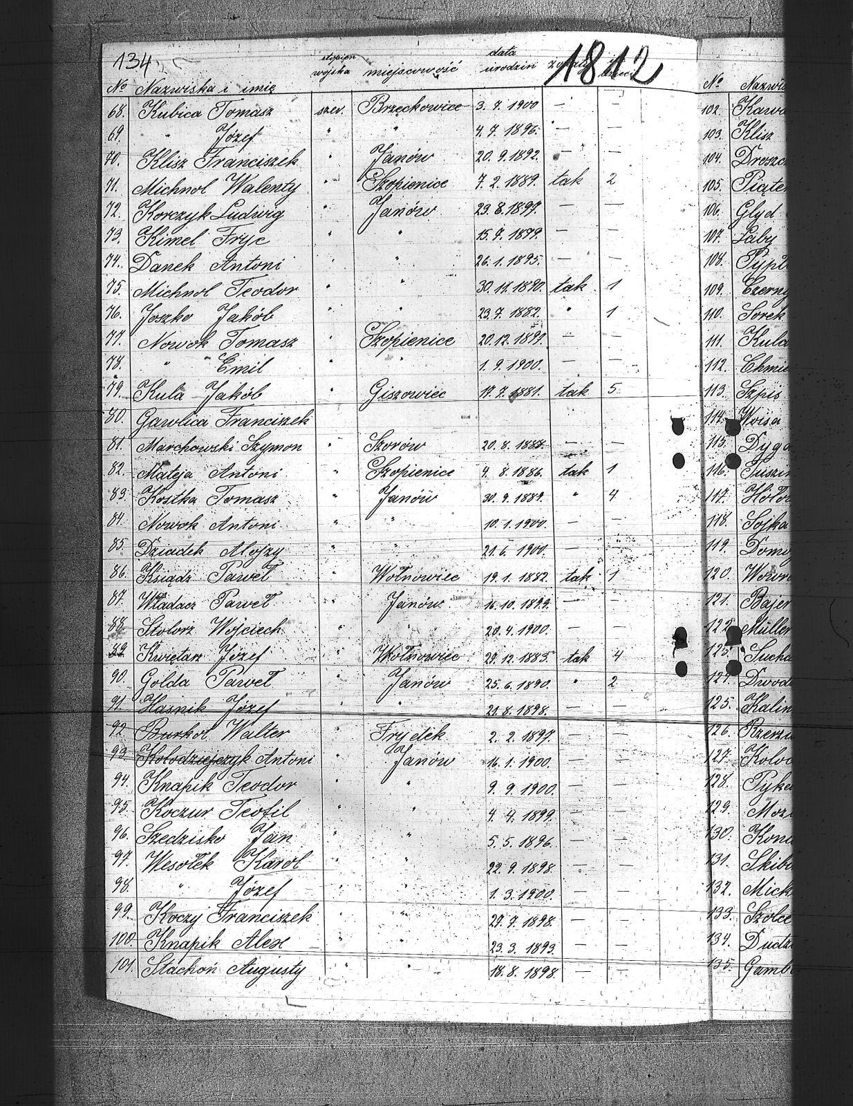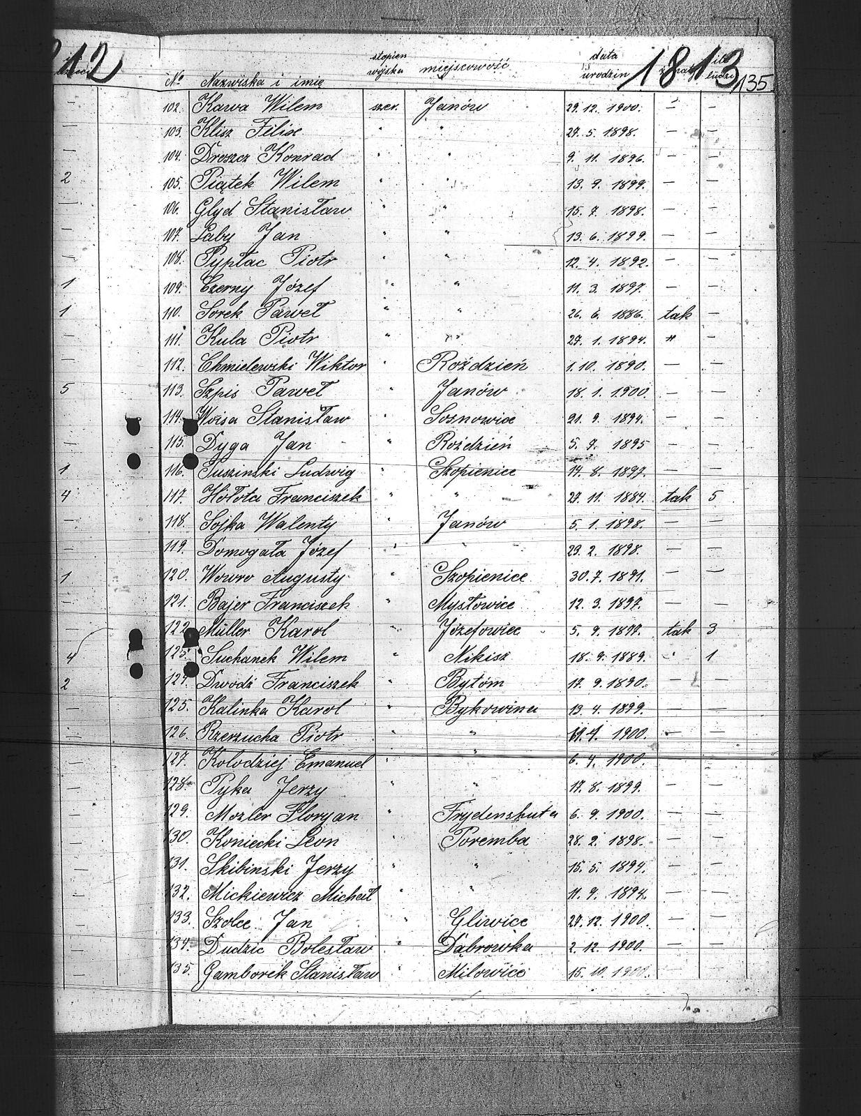 Bajer, Franciszek; Banasz, Wiktor; Brodacki, Paweł; Buchcik, Jan; Burkot, Walter; Chmielewski, Wiktor; Cigała, Teodor; Cypionka, Paweł; Cypionka, Piotr; Czernecki, Teodor; Czerny, Józef; Czop, Robert; Danek, Antoni; Daniel, Józef; Dlocik, Józef; Dłubis, Jan; Domogała, Józef; Dreszcz, Konrad; Dudzic, Bolesław; Dudzik, Franciszek; Dwodz, Franciszek; Dyga, Jan; Dytko, Franciszek; Dytko, Michał; Dziadek, Alojzy; Franik, Stanisław; Gabor, Józef; Gabor, Ludwig; Gamborek, Stanisław; Gaszczyk, Józef; Gawlica, Franciszek; Glyd, Stanisław; Głowala, Józef; Golda, Paweł; Grabelus, Alojzy; Gros, Jan; Grudniok, Piotr; Gruszka, Paweł; Gryc, Edmund; Hadyk, Piotr; Hadyk, Wilem; Hasnik, Józef; Hering, Jan; Hołota, Franciszek; Hołota, Paweł; Hołota, Wiktor; Howaniec, Władyslaw; Jan, Wilem; Jaromin, Jan; Joszko, Jakub; Kalinka, Karol; Kawa, Wilem; Kimel, Fryc; Klama, Augustyn; Klisz, Feliks; Klisz, Franciszek; Knapik, Aleks; Knapik, Teodor; Koczur, Teofil; Koczy, Franciszek; Kolodziejczyk, Antoni; Kołodziej, Emanuel; Kołodziej, Teodor; Kołodziej, Wilem; Koniecki, Leon; Końca, Richard; Korczyk, Jan; Korczyk, Ludwig; Kornke, Konrad; Kostka, Tomasz; Ksiądz, Paweł; Kubica, Józef; Kubica, Tomasz; Kuc, Karol; Kula, Jakub; Kula, Piotr; Kurcyk, Wojciech; Kwięntarz, Józef; Laby, Jan; Latocha, Franciszek; Macek, Paweł; Manowski, Antoni; Marchowski, Szymon; Maślorz, Clemens; Mateja, Antoni; Materna, Ryszard; Mazur, Wincenty; Michnol, Teodor; Michnol, Walenty; Mickiewicz, Michał; Molenda, Edward; Moll, Adolf; Mozler, Florian; Muller, Karol; Musioł, Klemens; Musioł, Paweł; Mutke, Paweł; Myndera, Jan; Nieszporek, Robert; Nowok, Antoni; Nowok, Emil; Nowok, Tomasz; Oleś, Józef; Pabis, Jan; Paljon, Piotr; Pasternak, Teodor; Piątek, Wilem; Pietrecki, Wiktor; Piguła, Franciszek; Płocica, Stanislaw; Pyka, Jerzy; Pypłac, Piotr; Roczek, Antoni; Rzerzucha, Piotr; Sidlo, Franciszek; Sitko, Augustyn; Siwy, Szczepan; Skibiński, Jerzy; Słota, Antoni; Słota, Emanuel; Słota, Józef; Słota, Paweł; Sojka, Konrad; Sojka, Walenty; Sorek, Paweł; Sroka, Stanisław; Stachoń, Augusty; Stawicki, Maks; Stefański, Stanisław; Stolorz, Jan; Stolorz, Konrad; Stolorz, Wojciech; Suchanek, Wilem; Szczelczyk, Wincenty; Szedzisko, Jan; Szeja, Szymon; Szola, Jan; Szotesek, Szczepan; Szpis, Paweł; Szprenc, Wincenty; Sztec, Wilem; Tuszinski, Ludwig; Ulman, Franciszek; Wesołek, Józef; Wesołek, Karol; Władacz, Paweł; Woisa, Stanisław; Wowro, Augustyn; Wyphoł, Franciszek; Zagracki, Franciszek; Żeleski, Alfons; |