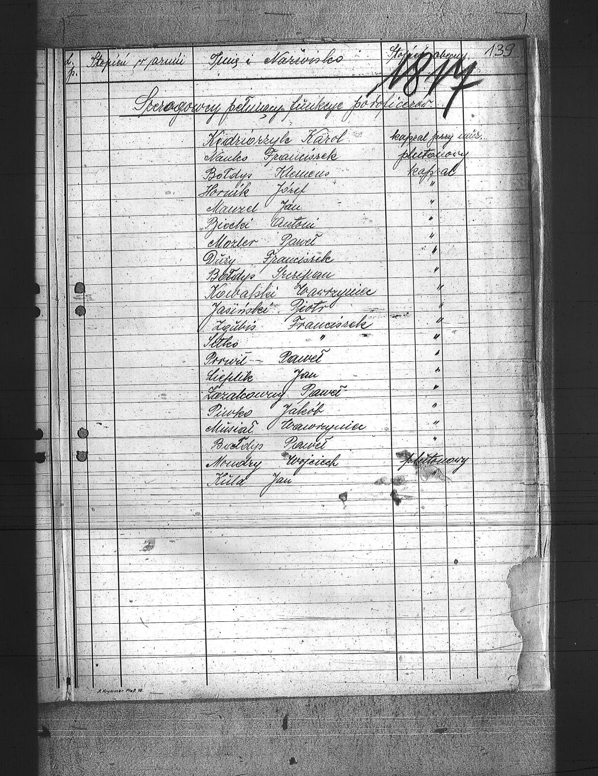 | Osoby | Biecki, Antoni; Bołdys, Klemens; Bołdys, Szczepan; Brołdys, Paweł; Cieplik, Jan; Duży, Franciszek; Hornik, Józef; Jasiński, Piotr; Kędziorzyk, Karol; Kowalski, Wawrzyn; Kula, Jan; Mauzel, Jan; Mondry, Wojciech; Mozler, Paweł; Musiał, Wawrzyn; Nauko, Franciszek; Piwko, Jakub; Porwił, Paweł; Sitko, Franciszek; Zazalcowny, Paweł; Zgubis, Franciszek; |