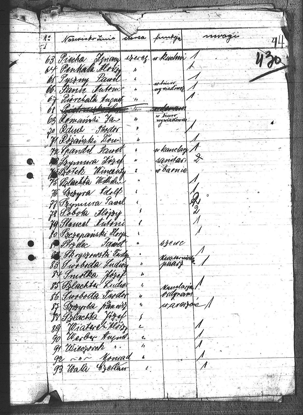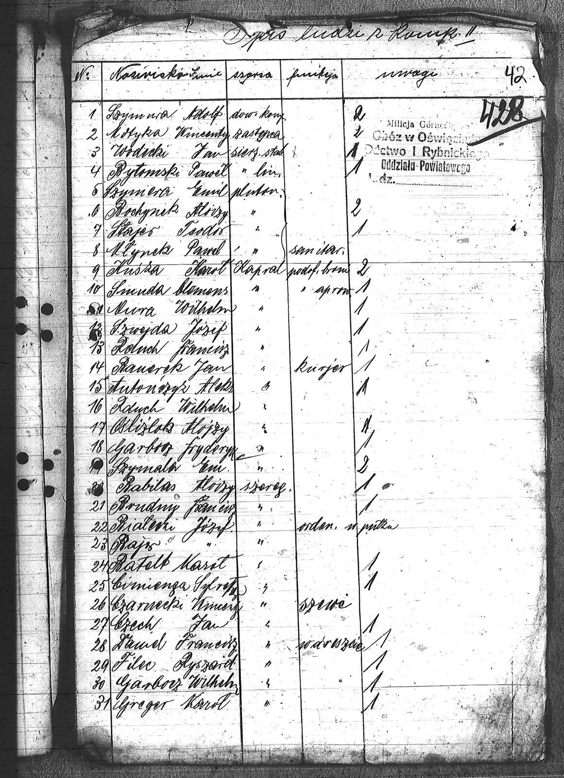 Antończyk, Aleks; Bajor, Józef; Bałolt, Karol; Białecki, Józef; Bochynek, Alojzy; Brudny, Franciszek; Bytomski, Paweł; Cimienga, Teodor; Czarnecki, Wincenty; Czech, Jan; Daniel, Franciszek; Dziuba, Franciszek; Filec, Ryszard; Garbocz, Wilhelm; Garbosz, Franciszek; Garbosz, Fryderyk; Gonsior ; Gonsior, Józef; Grabka, Alojzy; Greger, Karol; Gruszka, Henryk; Hanak, Ignacy; Jurczyk, Alojzy; Kaczmarczyk, Emil; Kansek, Jan; Klimsza, Antoni; Kostorz, Franciszek; Kotyka, Wincenty; Król, Bolesław; Kucharczyk, Alojzy; Kucharczyk, Ludwik; Kuczera, Franciszek; Kuliz, Wiktor; Kuśka, Gerhard; Kuśka, Karol; Kuśka, Robert; Kuśka, Wincenty; Marek, Alojzy; Markiton, Jerzy; Matera, Ludwik; Matuszczyk, Maks; Młynek, Franciszek; Młynek, Paweł; Motyka, Wilhelm; Mrożek, Ludwik; Mura, Wilhelm; Niesporek, Franc; Ochojski, Paweł; Ośliźlok, Alojzy; Panader, Ig.; Panic, Antoni; Penkalla, Alojzy; Piecha, Antoni; Piecha, Florian; Piecha, Ignacy; Pierchała, Augustyn; Pompa, Teofil; Pyszny, Paweł; Rabilas, Alojzy; Ranerek, Jan; Rduch, Franciszek; Rduch, Teodor; Rduch, Wilhelm; Romański, Jan; Rózga, Jan; Różański, Donat; Skryszowski, Ferdynand; Smołka, Józef; Smuda, Klemens; Sobota, Alojzy; Spandel, Paweł; Stajer, Teodor; Stencel, Antoni; Strzelec, Paweł; Swoboda, Ludwik; Swoboda, Teodor; Szczepański, Florian; Szczyra, Adolf; Szczyrba, Franciszek; Szlachta, Józef; Szlachta, Wilhelm; Szlachter, Ludwik; Szotek, Wincenty; Szwejda, Josef; Szymala, Emil; Szymera, Emil; Szymura, Adolf; Szymura, Józef; Szymura, Paweł; Wala, Czesław; Wala, Stanisław; Werber, Augustyn; Wiaterek, Alojzy; Wieczorek, Augustyn; Wieczorek, Konrad; Wodecki, Jan; Wodecki, Konstanty; Wojak, Augustyn; Zdrzałek, Wilhelm; |