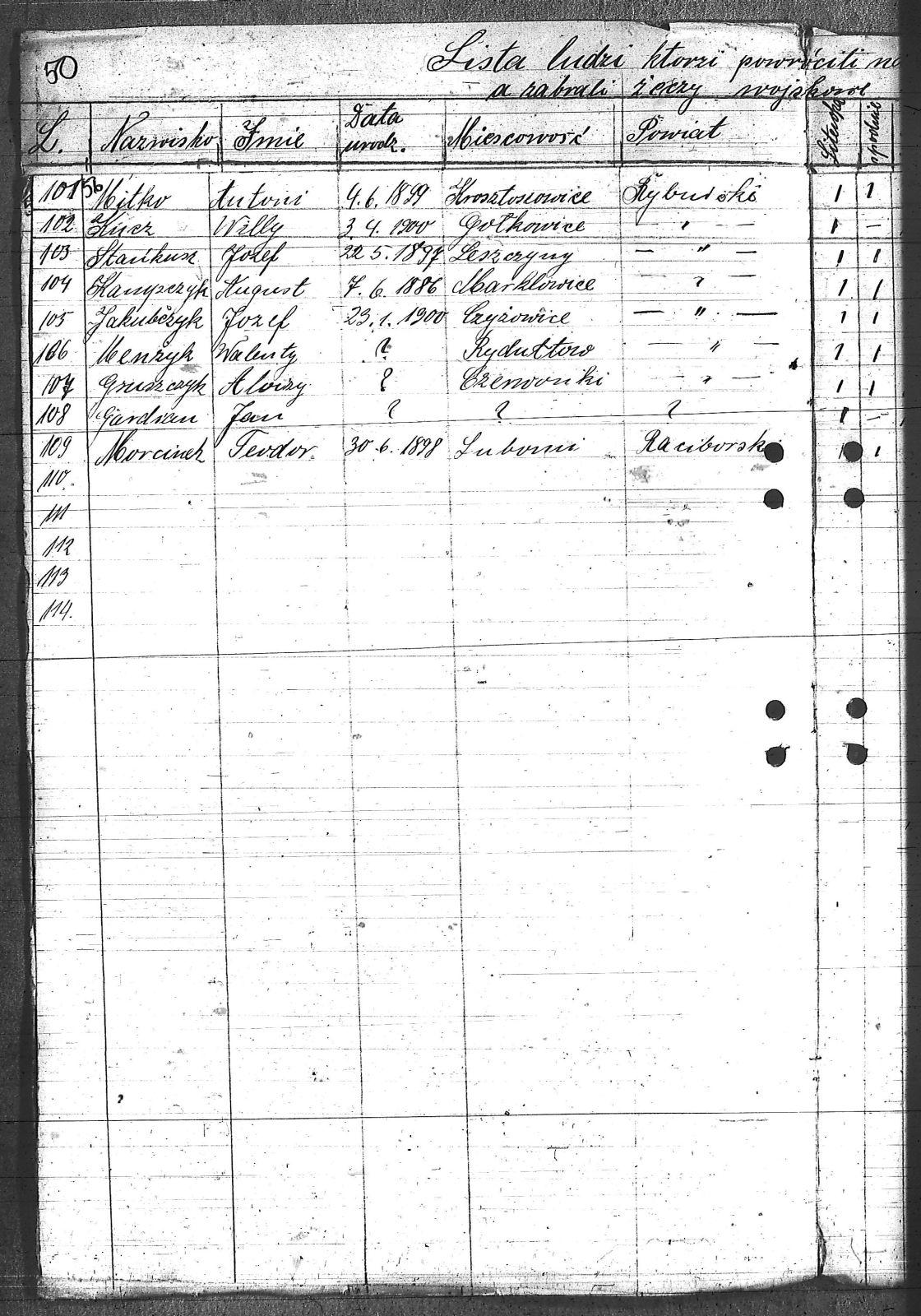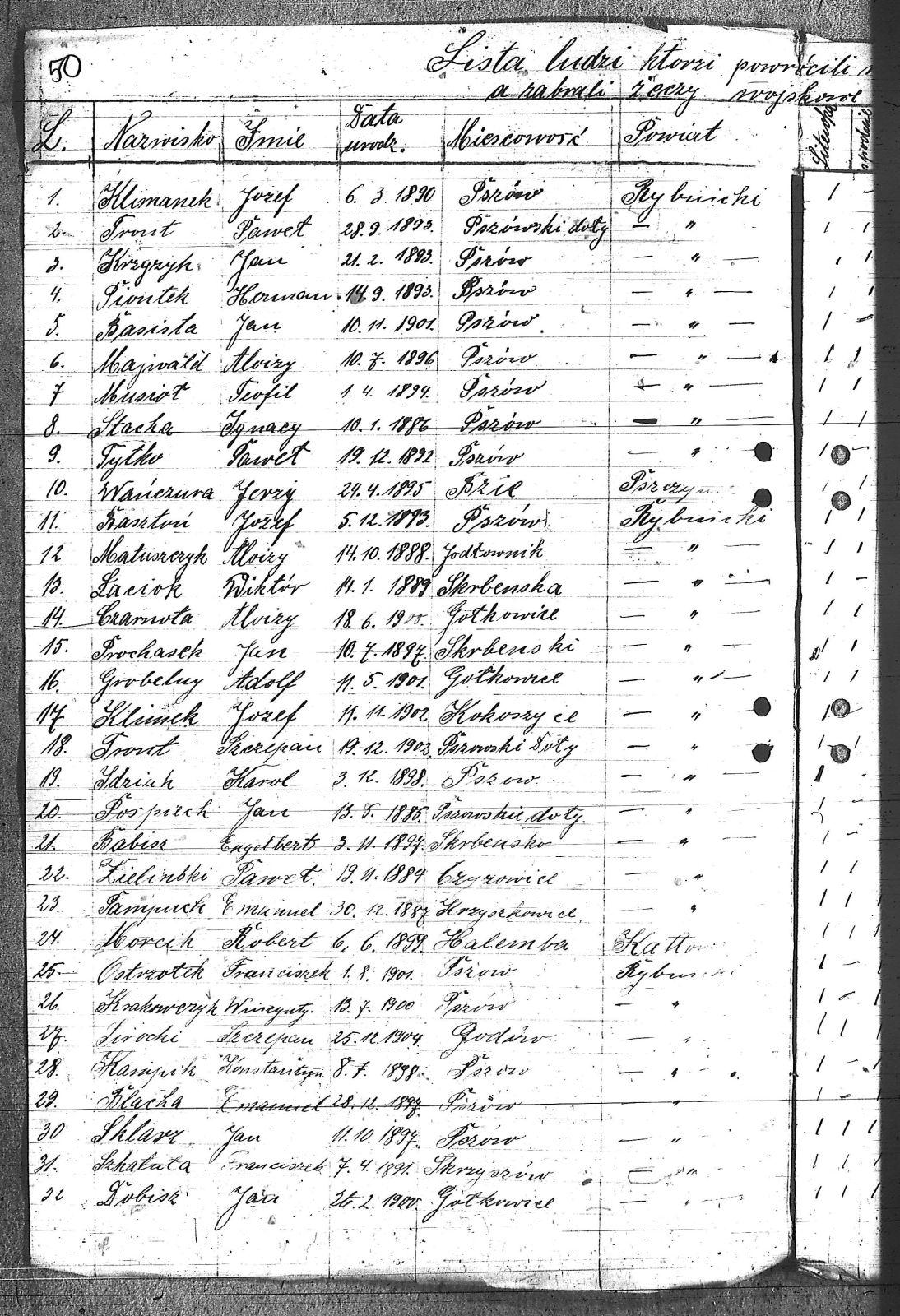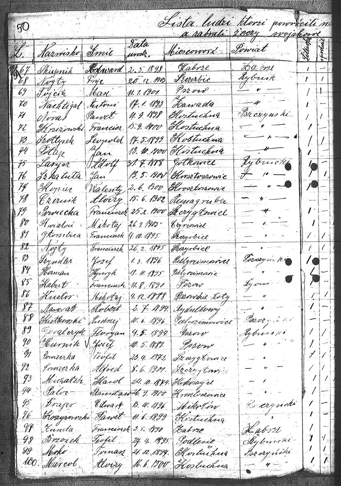 Babisz, Engelbert; Basista, Jan; Basista, Paweł; Baszton, Emanuel; Basztoń, Józef; Białek, Willy; Blacha, Emanuel; Brajer, Edward; Brzozek, Teofil; Cięciała, Franciszek; Czarnota, Alojzy; Czernik, Alojzy; Dobisz, Jan; Dworok, Józef; Fojcik, [nieczytelne]; Gardian, Jan; Glum, Karol; Głombica, Franciszek; Gniszczyk, Alojzy; Góralczyk, Florian; Grajner, Emil; Grobelny, Adolf; Herman, Henryk; Hurnik, Józef; Idziak, Karol; Iksal, Maksymilian; Jabłonka, Jakub; Jakubczyk, Józef; Kabut, Franciszek; Kamijczyk, August; Kampik, Konstanty; Kiełkowski, Andrzej; Klimanek, Józef; Klimek, Józef; Klinek, Augustyn; Kłosek, Aloizy; Koczor, Wiktor; Kopiec, Walenty; Kozub, Ludwig; Krakowczyk, Wincenty; Krentosz, Antoni; Krziżowski, Franciszek; Krziżyk, Franciszek; Krzyżowski, Paweł; Krzyżyk, Jan; Kucz, Willy; Kurpanik, Ludwik; Kustoś, Mikołaj; Kwiatoń, Mikołaj; Larysz, Adolf; Larysz, Józef; Łaciok, Wiktor; Łuska, Anzelm; Majwald, Alojzy; Marcol, Alojzy; Masłowski, Jan; Matuszczyk, Alojzy; Menżyk, Walenty; Michałek, Karol; Minot, Franciszek; Mitko, Antoni; Moko, Tomasz; Morcik, Robert; Morcinek, Teodor; Musioł, Teofil; Nachtigal, Antoni; Nawrat, Józef; Nawrat, Robert; Nogły, Franciszek; Nogły, Fryc; Noras, Paweł; Oleś, Franciszek; Ostrzałek, Franciszek; Paloc, Stanisław; Pampuch, Emanuel; Piontek, Herman; Połap, Józef; Pośpiech, Jan; Potap, Jan; Potysz, Franciszek; Powiecka, Franciszek; Powieczka, Alfred; Powieczka, Teofil; Prochasek, Jan; Reś, Wiktor; Salamon, Jan; Sirocki, Szczepan; Siudmok, Jan; Sklarz, Jan; Skupnik, Edward; Spajda, Alojzy; Stacha, Ignacy; Stańkusz, Józef; Supok, Willy; Szkatuła, Franciszek; Szkatuła, Jan; Szklarz, Franciszek; Szołtysek, Leopold; Szuta, Edward; Szyndler, Józef; Tront, Paweł; Tront, Szczepan; Tytko, Paweł; Wańczura, Jerzy; Zdziebło, Willy; Zganiacz, Willy; Zieliński, Paweł; Zunda, Franciszek; Żerzik, Karol; |