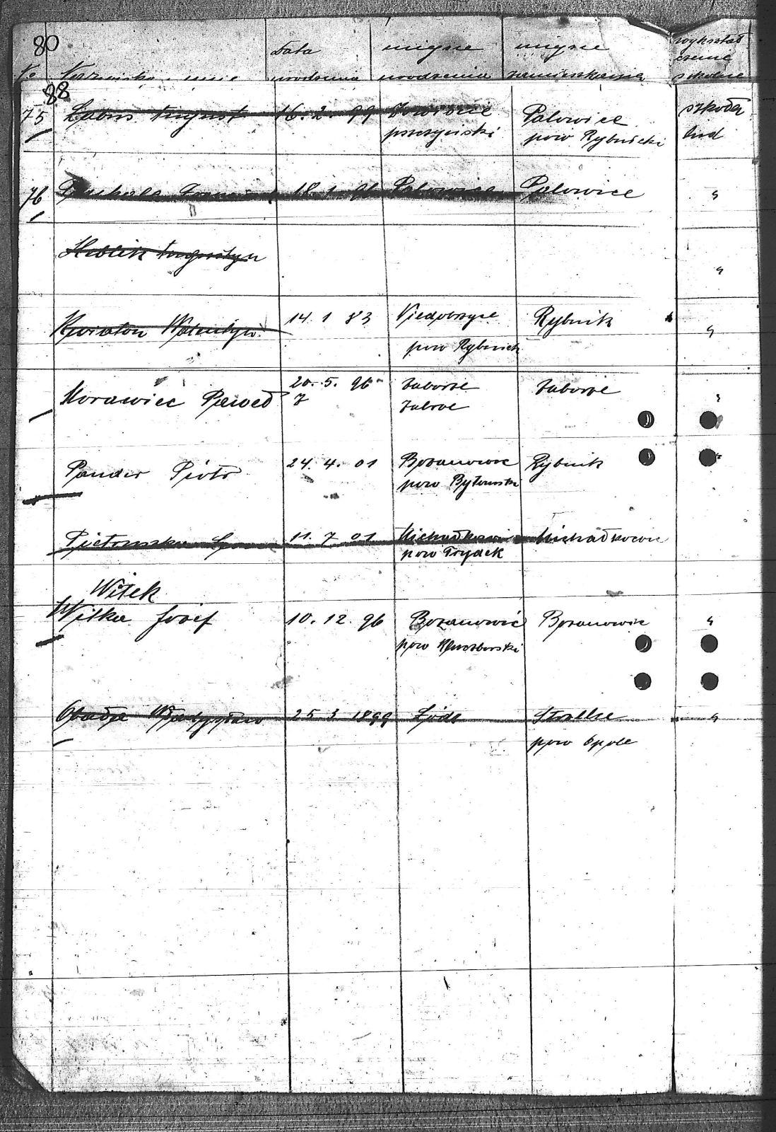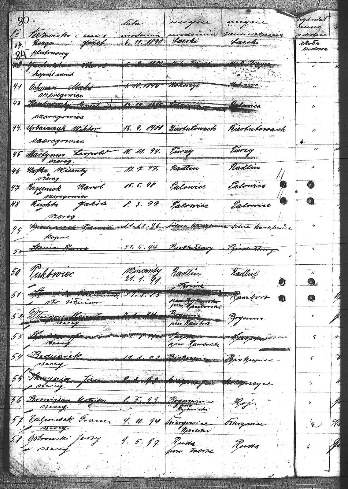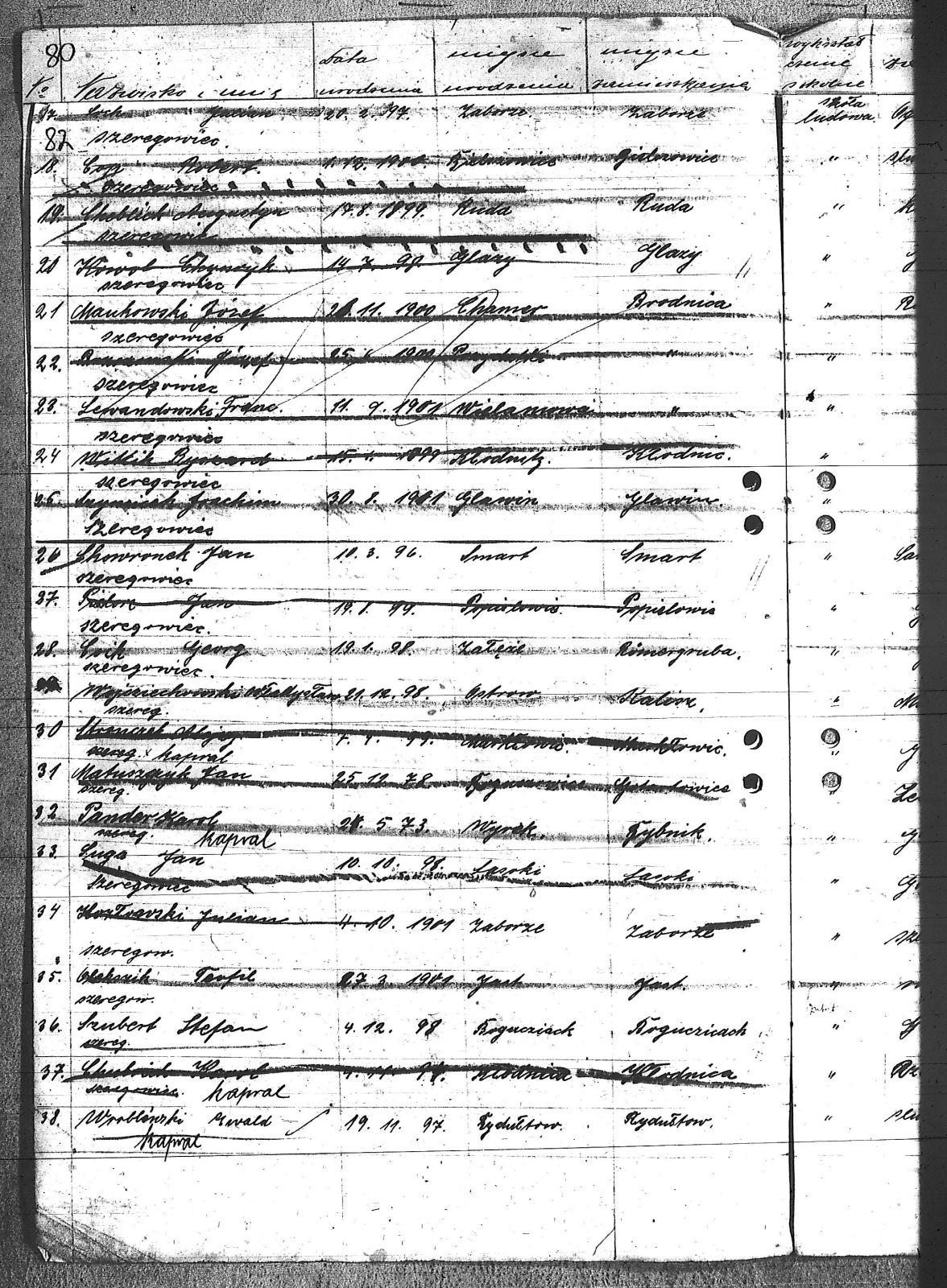 | Osoby | Buchta, Jakub; Grobosz, Bronisław; Jalpiczek, Franc; Kafka, Wincenty; Kołyka, Bronisław; Lewandowski, Franc; Mankowski, Józef; Martynus, Leopold; Morawiec, Paweł; Ostrowski, Jerzy; Panter, Piotr; Pukowiec, Wincenty; Rzyczniok, Karol; Salamon, Szymon; Skowronek, Jan; Szubert, Stefan; Urbaińczyk, Wiktor; Urbańczyk, Franciszek; Witek, Józef; Wróblewski, Ewald; |