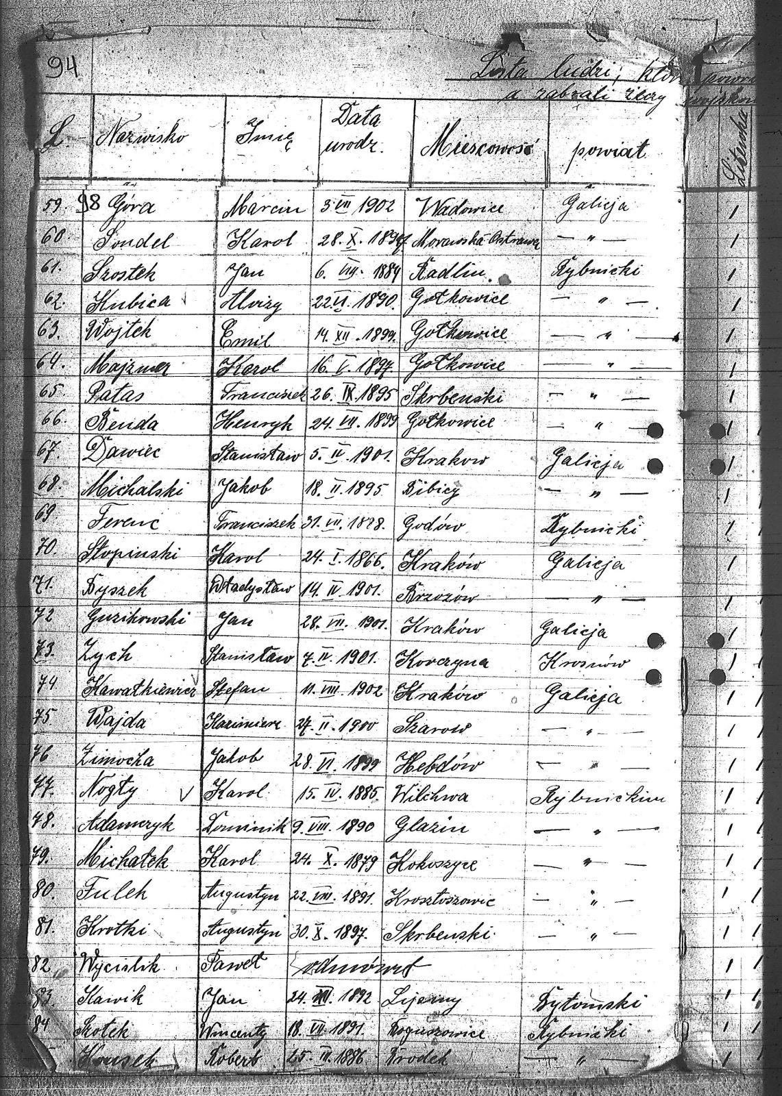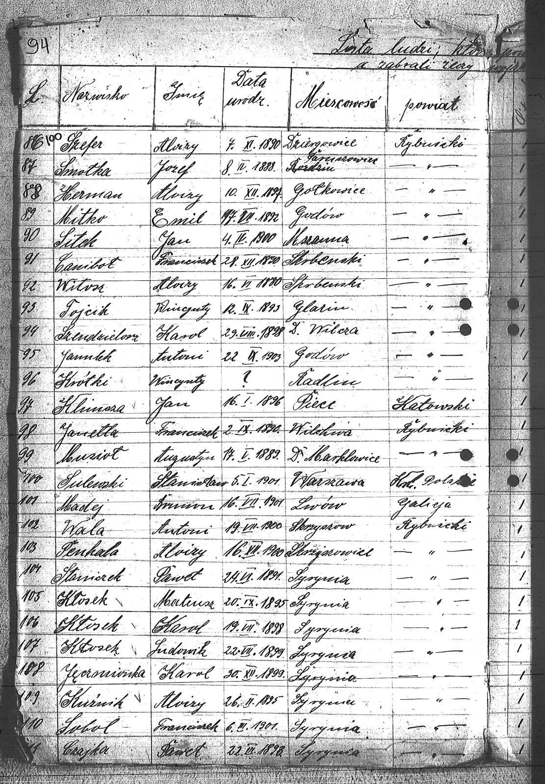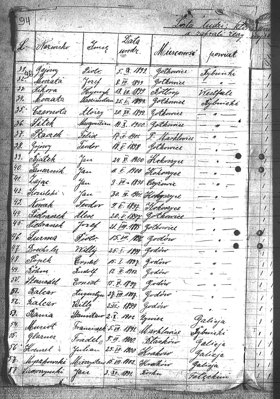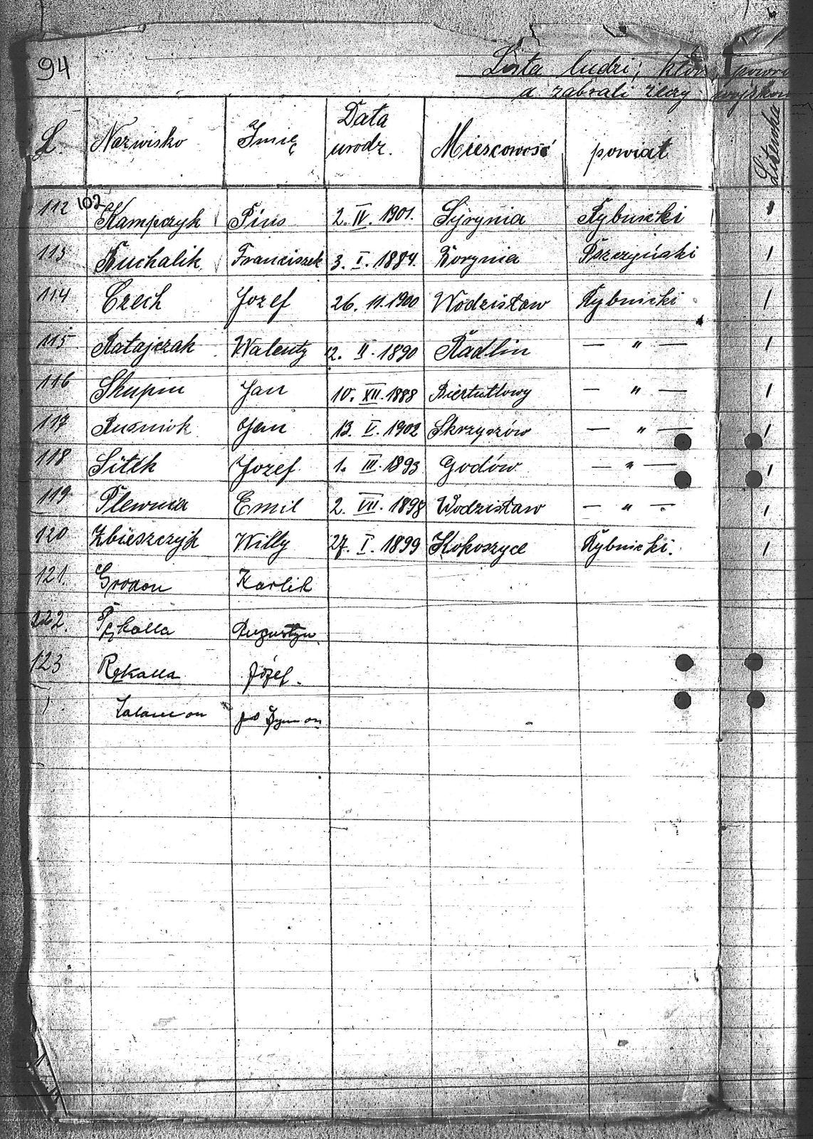 Adamczyk, Dominik; Adamczyk, Ludwik; Balcar, Augustyn; Balcar, Willy; Bania, Stanisław; Benda, Henryk; Bjałek, Jan; Bohm, Rudolf; Brachmański, Mikołaj; Brachmański, Roman; Brzoza, Franciszek; Brzoza, Józef; Caniboł, Franciszek; Czajka, Paweł; Czarnota, Alojzy; Czarnota, Piotr; Czech, Józef; Dawiec, Stanisław; Drechsler, Willy; Dyszek, Władysław; Ferenc, Franciszek; Ferenc, Józef; Fojcik, Roman; Fojcik, Wincenty; Fulek, Augustyn; Gajowy, Piotr; Gajowy, Teodor; Glazner, Fradel; Gorgol, Emil; Góra, Marcin; Grobelny, Józef; Grodon, Karlik; Guzikowski, Jan; Herman, Alojzy; Janulek, Antoni; Jęczmionka, Karol; Kampczyk, Pius; Kawałkiewicz, Stefan; Kawik, Jan; Klimsza, Jan; Klosek, Ludwik; Kłosek, Karol; Kłosek, Mateusz; Kozielski, Jan; Krasek, Robert; Krenzel, Julian; Krotki, Augustyn; Krótki, Wincenty; Kubich, Alojzy; Kuźnik, Alojzy; Łaciak, Ernest; Madej, Brunon; Majzner, Emil; Majzner, Franciszek; Majzner, Józef; Majzner, Karol; Michalski, Jakub; Michałek, Karol; Mitko, Emil; Moczała, Józef; Moczała, Maksymilian; Musioł, Augustyn; Musioł, Franciszek; Myszkowski, Mieczysław; Nagrabka, Stanisław; Nendza, Józef; Nogły, Karol; Nowak, Teodor; Patas, Franciszek; Penkala, Alojzy; Pękalla, Augustyn; Pietraszek, Aleks; Pietraszek, Józef; Plewnia, Emil; Płaczek, Feliks; Połysz, Jan; Połysz, Rudolf; Popek, Ernest; Prochowski, Alojzy; Ptaczek, Józef; Ratajczak, Walenty; Reclik, Józef; Rękalla, Józef; Ruchalik, Franciszek; Ruśniok, Jan; Salamon, Alojzy; Salamon, Szymon; Sanecznik, Jan; Siejak, Aleksander; Siewoszynski, Jan; Sikora, Henryk; Sitek, Jan; Sitek, Józef; Sitek, Maksymilian; Skupin, Jan; Smietana, Wawrzyn; Smółka, Józef; Sobol, Franciszek; Sondel, Karol; Staniczek, Paweł; Sternadel, Ernest; Stopinski, Karol; Sulewski, Stanisław; Surma, Piotr; Szefer, Alojzy; Szendzielon, Karol; Szostek, Jan; Szotek, Wincenty; Szymiczek, Józef; Wajda, Kazimierz; Wala, Antoni; Warzecha, Szymon; Wawrocz, Jan; Wawrosz, Franciszek; Witosz, Alojzy; Wojtek, Emil; Wyciślik, Paweł; Zając, Edward; Zając, Jan; Zając, Józef; Zbieszczyk, Willy; Zimocha, Jakub; Zych, Stanisław; |