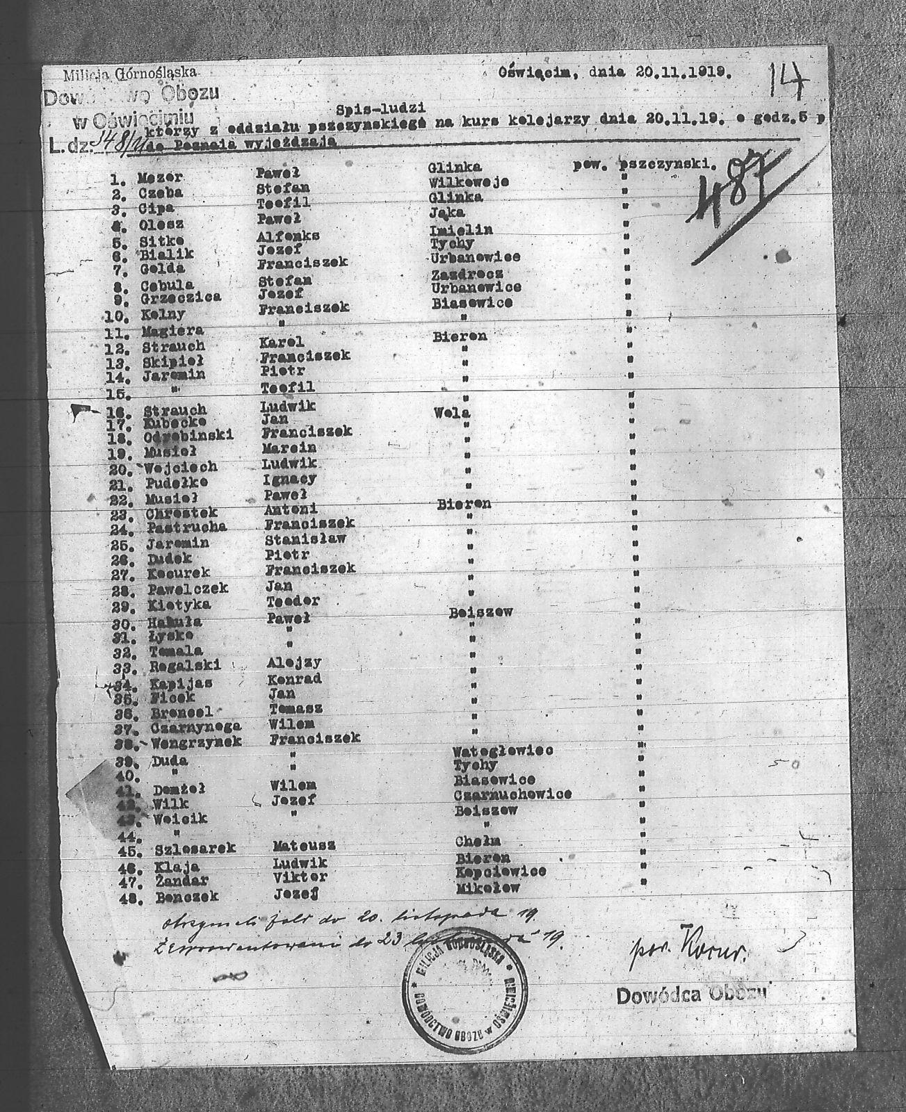 Bialik, Józef; Bonczek, Józef; Broncel, Tomasz; Cebula, Stefan; Chrostek, Antoni; Cipa, Teofil; Czarnynoga, Wilem; Czeba, Stefan; Domżoł, Wilem; Duda II, Franciszek; Duda, Franciszek; Dudek, Piotr; Ficek, Jan; Golda, Franciszek; Grzeczica, Józef; Hahuła, Paweł; Jaromin, Piotr; Jaromin, Stanisław; Jaromin, Teofil; Kapijas, Konrad; Kiotyka, Teodor; Klaja, Ludwik; Kocur; Kocurek, Franciszek; Kolny, Franciszek; Kubecko, Jan; Lysko, Paweł; Magiera, Franciszek; Mezor, Paweł; Musioł, Marcin; Musioł, Paweł; Odrobiński, Franciszek; Olesz, Paweł; Pastrucha, Franciszek; Pawelczek, Jan; Pudełko, Ignacy; Rogalski, Alojzy; Sitko, Alfons; Skipioł, Franciszek; Strauch, Karol; Strauch, Ludwik; Szlosarek, Mateusz; Tomala, Paweł; Wengrzynek, Franciszek; Wilk, Józef; Woicik, ; Woicik, Józef; Wojciech, Ludwik; Żandar, Wiktor; |