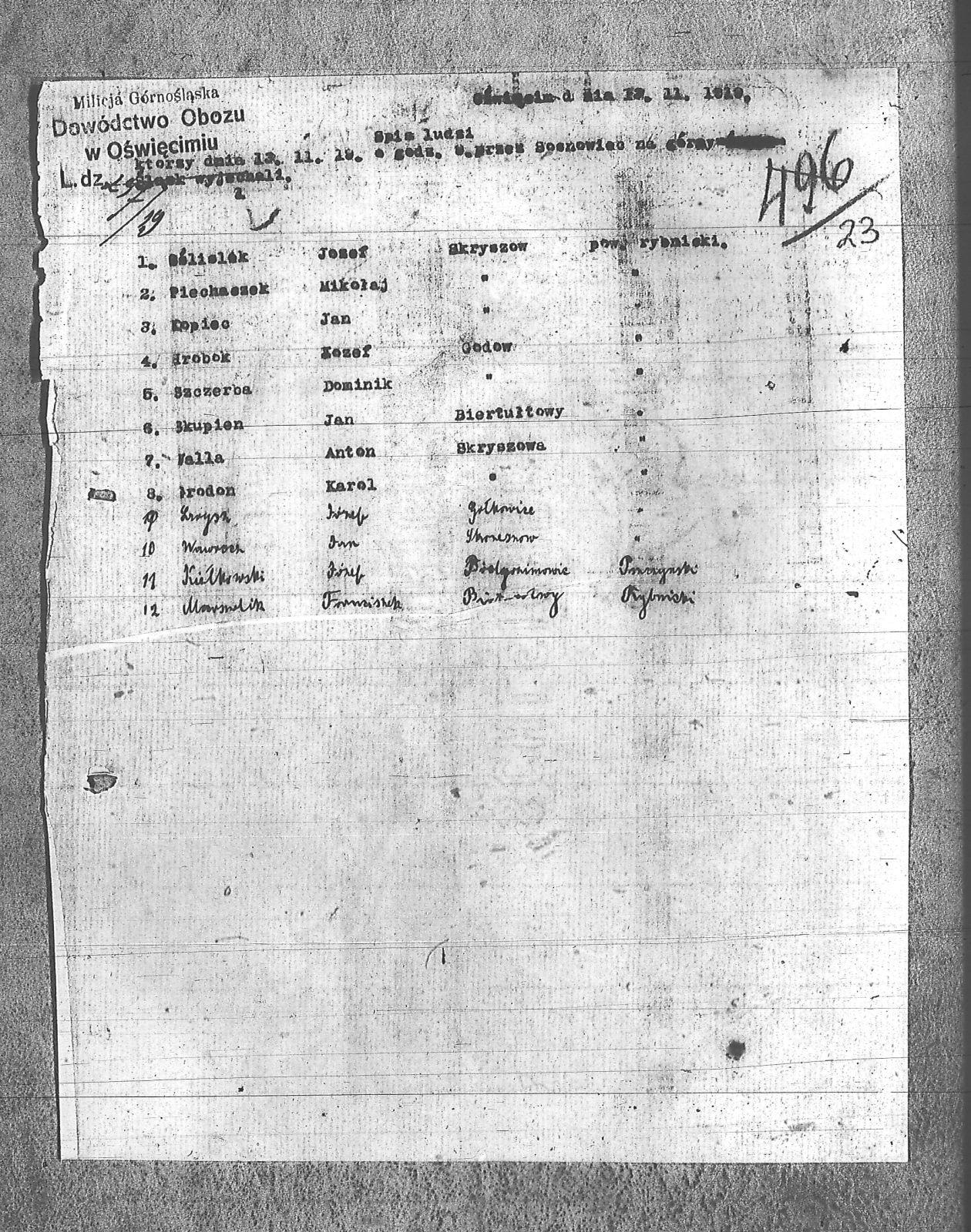 | Osoby | Grodom, Karol; Hrobok, Józef; Kopiec, Jan; Kułkowski, Józef; Larysz, Józef; Marszalik, Franciszek; Ośliślok, Józef; Piechaczek, Mikołaj; Skupień, Jan; Szczerba, Dominik; Walla, Anton; Wawrocz, Jan; |