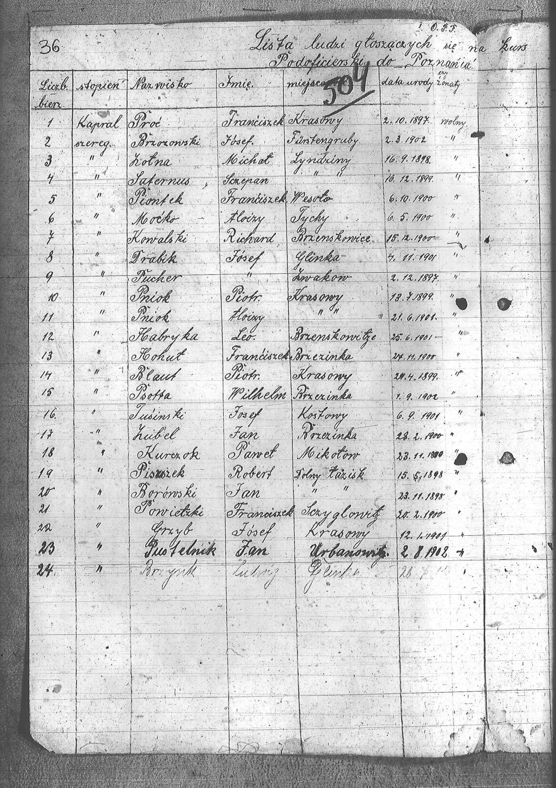 | Osoby | Blaut, Piotr; Borówski, Jan; Brzozowski, Józef; Brzynk, Ludwik; Drabik, Józef; Fusinski, Józef; Grzyb, Józef; Habryka, Leo.; Hohut, Franciszek; Kotna, Michał; Kowalski, Richard; Kurczok, Paweł; Mocko, Alojzy; Piontek, Franciszek; Piszczek, Robert; Pniok, Alojzy; Pniok, Piotr; Powietzki, Franciszek; Proc, Franciszek; Psotta, Wilhelm; Pucher, Józef; Pustelnik, Jan; Saternus, Szczepan; Zubel, Jan; |