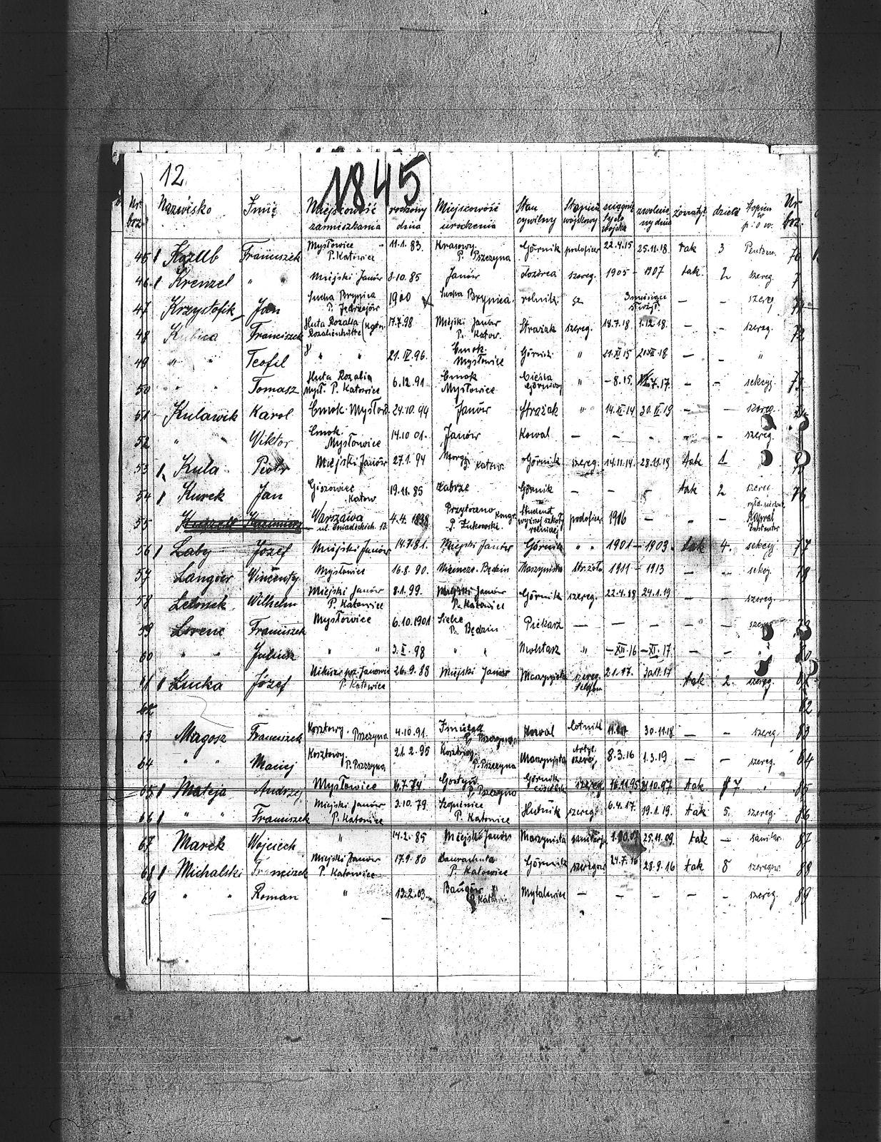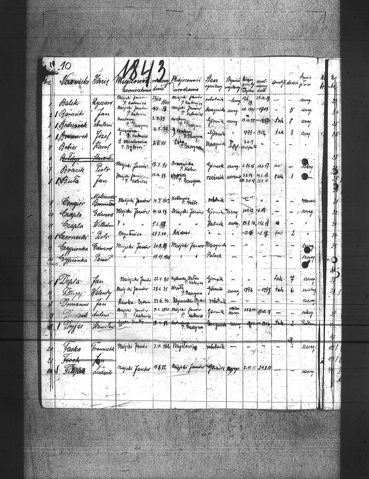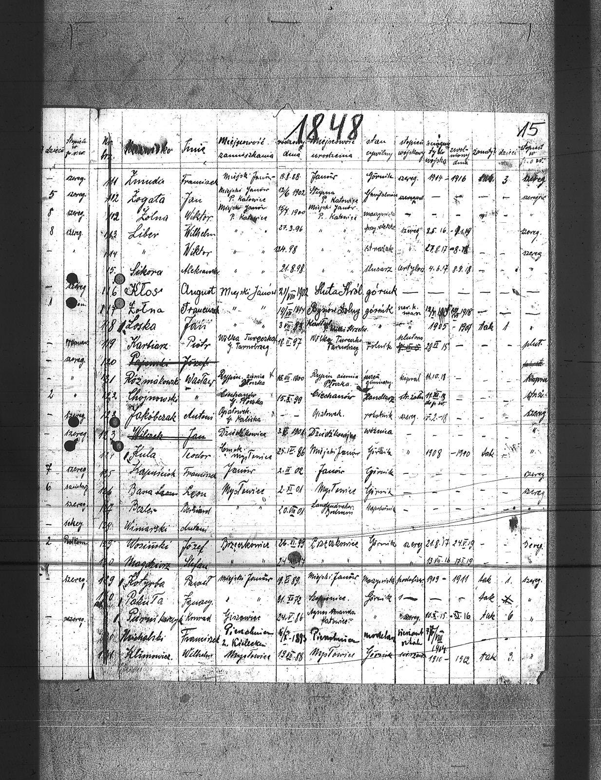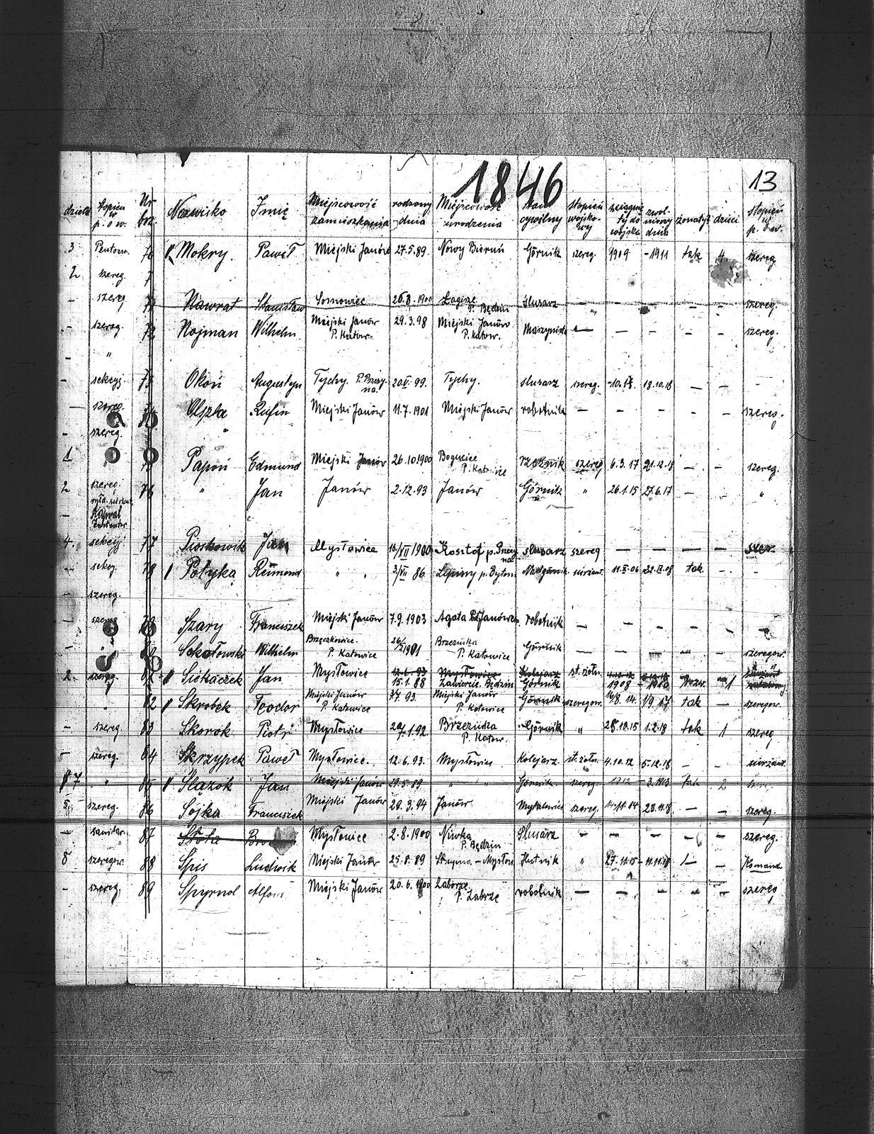Babiec, Karol; Balski, Ryszard; Barański, Jan; Basza, Leon; Bednarek, Antoni; Bednarek, Józef; Bezler, Bernard; Bracik, Piotr; Buła, Jan; Cengier, Aleksander; Chojnowski, Wacław; Czapla, Edward; Czapla, Wilhelm; Czernecki, Piotr; Czypionka, Edward; Czypionka, Paweł; Depta, Jan; Długaj, Walenty; Domanus, Jan; Dudzik, Antoni; Dyjas, Stanisław; Faska, Franciszek; Filipek, Ludwik; Garus, Alojzy; Garus, Jan; Gądzik, Tomasz; Gepferd, Tomasz; Goj, Jan; Goj, Józef; Goj, Wilhelm; Gołorz, Stefan; Gwiazda, Aleksander; Habryka, Paweł; Hachuła, Józef; Hadrowaniec, Mateusz; Hassa, Konrad; Jakóbczak, Antoni; Janko, Emanuel; Jóźwiak, Józef; Jurczyk, Jan; Kamieniorz, Jan; Kapuściok, Alojzy; Kapuściok, Franciszek; Karbiarz, Piotr; Klimowicz, Wilhelm; Kłos, August; Kłos, Bernard; Kłos, Wincenty; Kocur, Jan; Korzonek, Juliusz; Kotyrba, Paweł; Kotyrba, Wiktor; Kozub, Franciszek; Krenzel, Franciszek; Krzystofik, Jan; Kubica, Franciszek; Kubica, Teofil; Kubica, Tomasz; Kula, Piotr; Kula, Teodor; Kulawik, Karol; Kulawik, Wiktor; Kurek, Jan; Kus, Jan; Laby, Józef; Langier, Wincenty; Letoszek, Wilhelm; Liber, Wiktor; Liber, Wilhelm; Lorenc, Franciszek; Lorenc, Juliusz; Loska, Jan; Łucka, Józef; Magdziorz, Stefan; Magosz, Franciszek; Magosz, Maciej; Marek, Wojciech; Mateja, Andrzej; Mateja, Franciszek; Michalski, Franciszek; Michalski, Roman; Mokry, Paweł; Nawrat, Stanisław; Nojman, Wilhelm; Okoń, Augustyn; Olszka, Rufin; Pakuła, Ignacy; Papoń, Edmund; Papoń, Jan; Piernikarczyk, Konrad; Pioskowik, Jan; Potyka, Reimond; Różniakowski, Wacław; Siekaczek, Jan; Sikora, Aleksander; Skorok, Piotr; Skrobek, Teodor; Skrzypek, Paweł; Sladkowski, Alfred; Słota, Bro.; Sojka, Franciszek; Sokołowski, Wilhelm; Spis, Ludwik; Spyrnol, Alfons; Stęchły, Franciszek; Stolarczyk, Jan; Styś, Alojzy; Styś, Józef; Sycha, Wilhelm; Szary, Franciszek; Szwajerk, Roman; ślązok, Jan; Tomanek, Augustyn; Tubacki, Stanisław; Urbańczyk, Wilhelm; Wieczorek, Paweł; Winiarski, Antoni; Wiśniowski, Wincenty; Właszek, Walenty; Wolf, Paweł; Wosiński, Józef; Wójcik, Wilhelm; Wróbel, Augustyn; Wróbel, Michał; Wróblewski, Robert; Zalewski, Augustyn; Zmuda, Konrad; Żmuda, Franciszek; Żogała, Jan; Żolna, Wiktor; Żołna, Franciszek; |