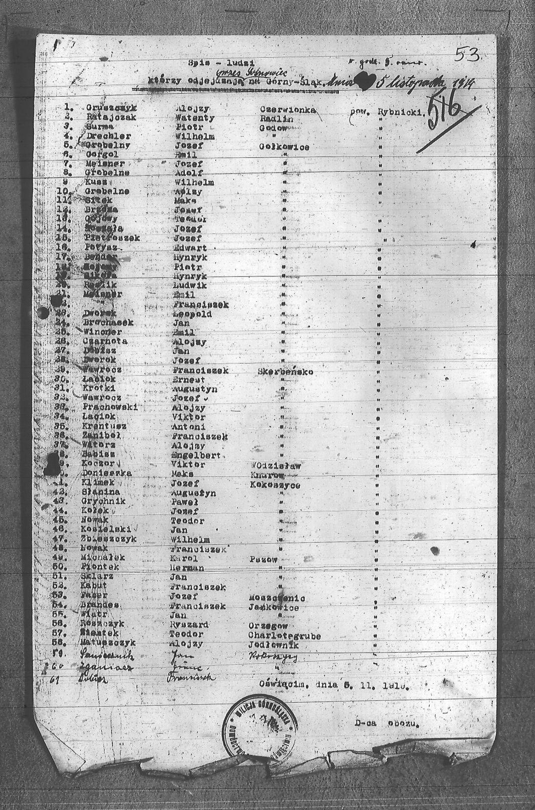 [nieczytelne], Piotr; Babisz, Engelbert; Bender, Henryk; Brandes, Franciszek; Brochasek, Jan; Brzoza, Józef; Czarnota, Alojzy; Dobisz, Franciszek; Dobisz, Jan; Donieszka, Maksymilian; Drechler, Wilhelm; Dworok, Józef; Dworok, Leopold; Faber, Józef; Gojowy, Teodor; Gorgol, Emil; Grobelne, Adolf; Grobelne, Alojzy; Grobelny, Józef; Gruszczyk, Alojzy; Grychnik, Paweł; Kabut, Franciszek; Klimek, Józef; Koczor, Victor; Kołek, Józef; Kosielski, Jan; Krentusz, Antoni; Krotki, Augustyn; Kusz, Wilhelm; Laciok, Ernest; Łaciok, Victor; Matuszczyk, Alojzy; Meisner, Emil; Meisner, Franciszek; Meisner, Józef; Michałek, Karol; Nowak, Framciszek; Nowak, Teodor; Pietroszek, Józef; Piontek, Herman; Potysz, Edward; Prachowski, Alojzy; Ratajczyk, Walenty; Reslik, Ludwik; Roszczyk, Ryszard; Saniecznik, Jan; Sikora, Henryk; Sitek, Maksymilian; Sklarz, Jan; Słanina, Augustyn; Surma, Piotr; Wawrocz, Franciszek; Wawrocz, Jozef; Wiatr, Jan; Wincer, Emil; Witorz, Alojzy; Zaniboł, Franciszek; Zbieszczyk, Wilhelm; Zganiacz, Franciszek; Zientak, Teodor; |