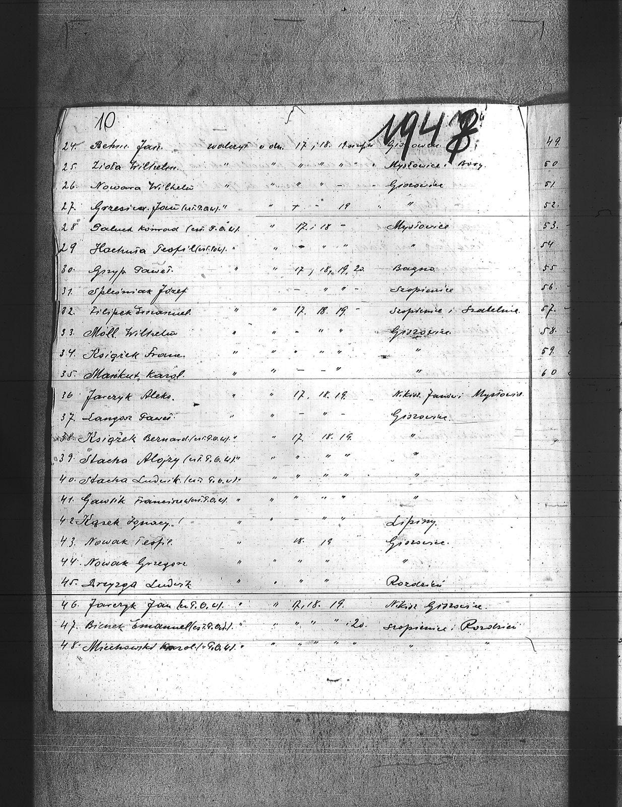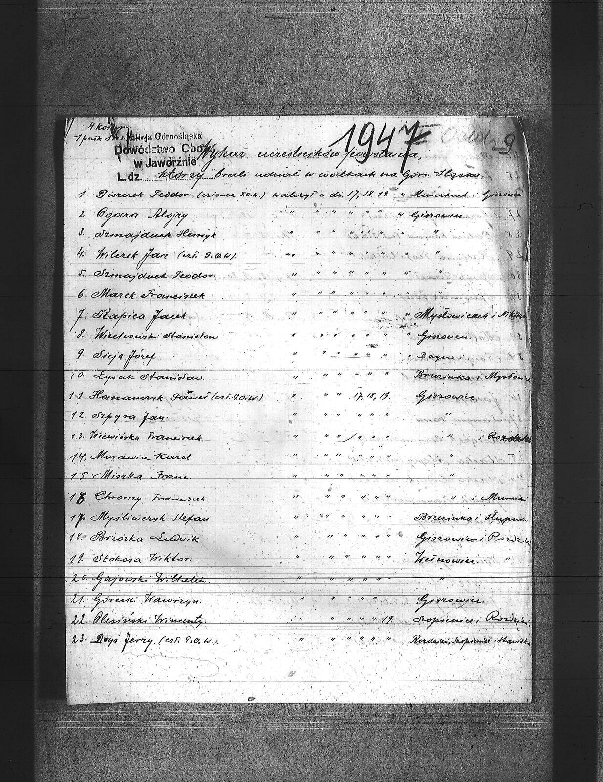 Bankiel, Józef; Behm, Jan; Bienek, Emanuel; Brzózka, Ludwik; Chromy, Franciszek; Cieplak, August; Dryś, Jerzy; Drzyzga, Ludwik; Filipek, Emanuel; Fogiel, Teodor; Gajowski, Wilhelm; Gawlik, Franciszek; Górecki, Wawrzyn; Grzesica, Jan; Grzyp, Paweł; Hachuła, Teofil; Hananczyk, Paweł; Jarczyk, Aleks; Jarczyk, Jan; Kapica, Jacek; Kązek, Ignacy; Knapik, Teodor; Kornek, Tomasz; Książek, Bernard; Książek, Franciszek; Kubiczek, Jan; Langosz, Paweł; Łysak, Stanisław; Macherski, Ludwik; Mańkut, Karol; Mazek, Franciszek; Miechowski, Karol; Miszka, Franciszek; Molek, Tomasz; Moll, Teodor; Moll, Wilhelm; Morawiec, Karol; Myśliwczyk, Stefan; Nowak, Grzegorz; Nowak, Teofil; Nowara, Wilhelm; Ogaza, Alojzy; Olesiński, Wincenty; Paluch, Konrad; Piszczek, Teodor; Sieja, Józef; Spleśniak, Józef; Stacha, Alojzy; Stacha, Ludwik; Stokosa, Wiktor; Strącik, Teodor; Strzyżyk, Jan; Szafranek, Alojzy; Szmajduch, Henryk; Szmajduch, Teodor; Szpyra, Jan; Wiechowski, Stanisław; Wiewiórka, Franciszek; Wilczek, Jan; Zioła, Wilhelm; |