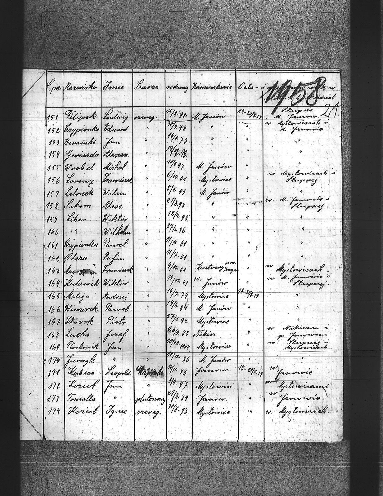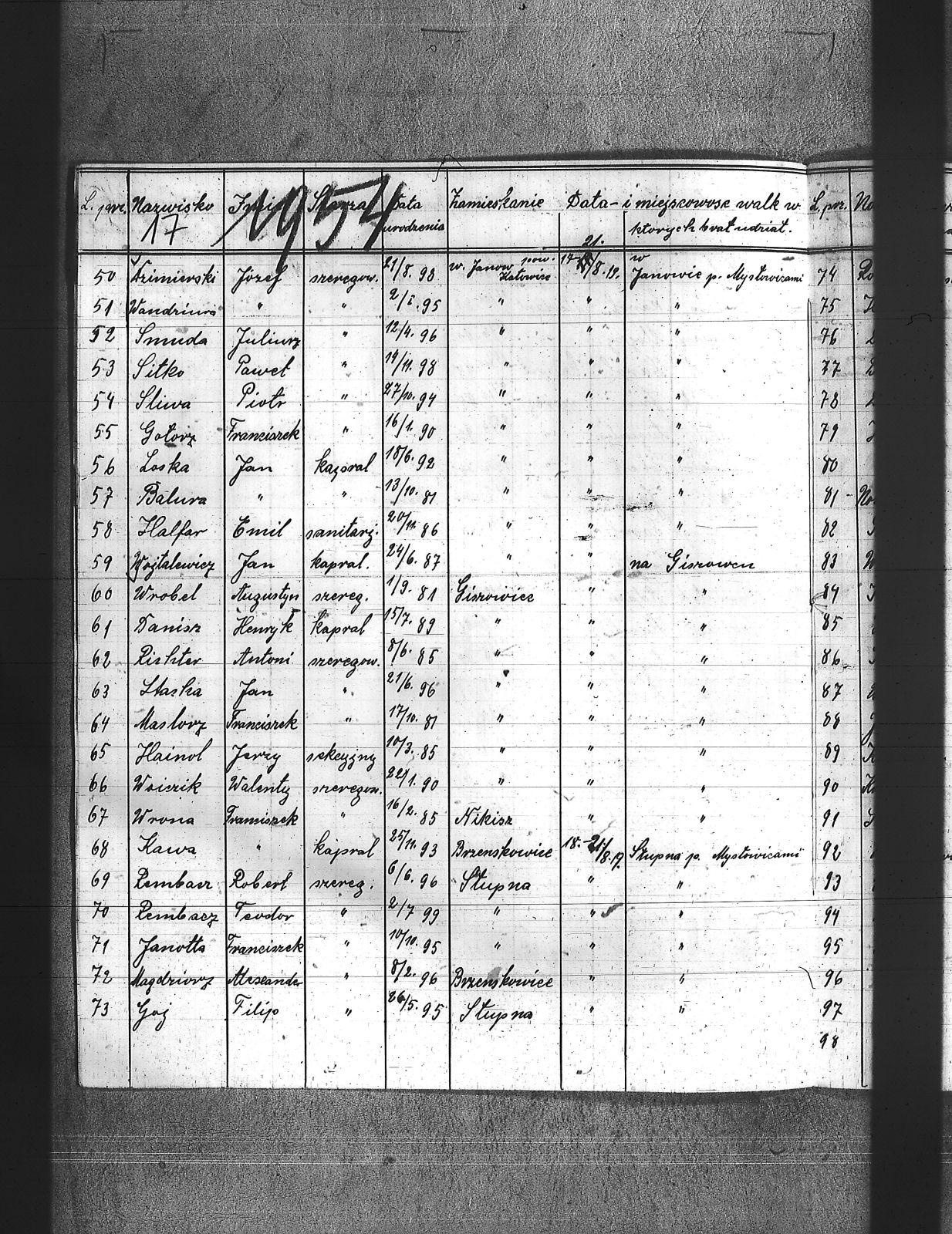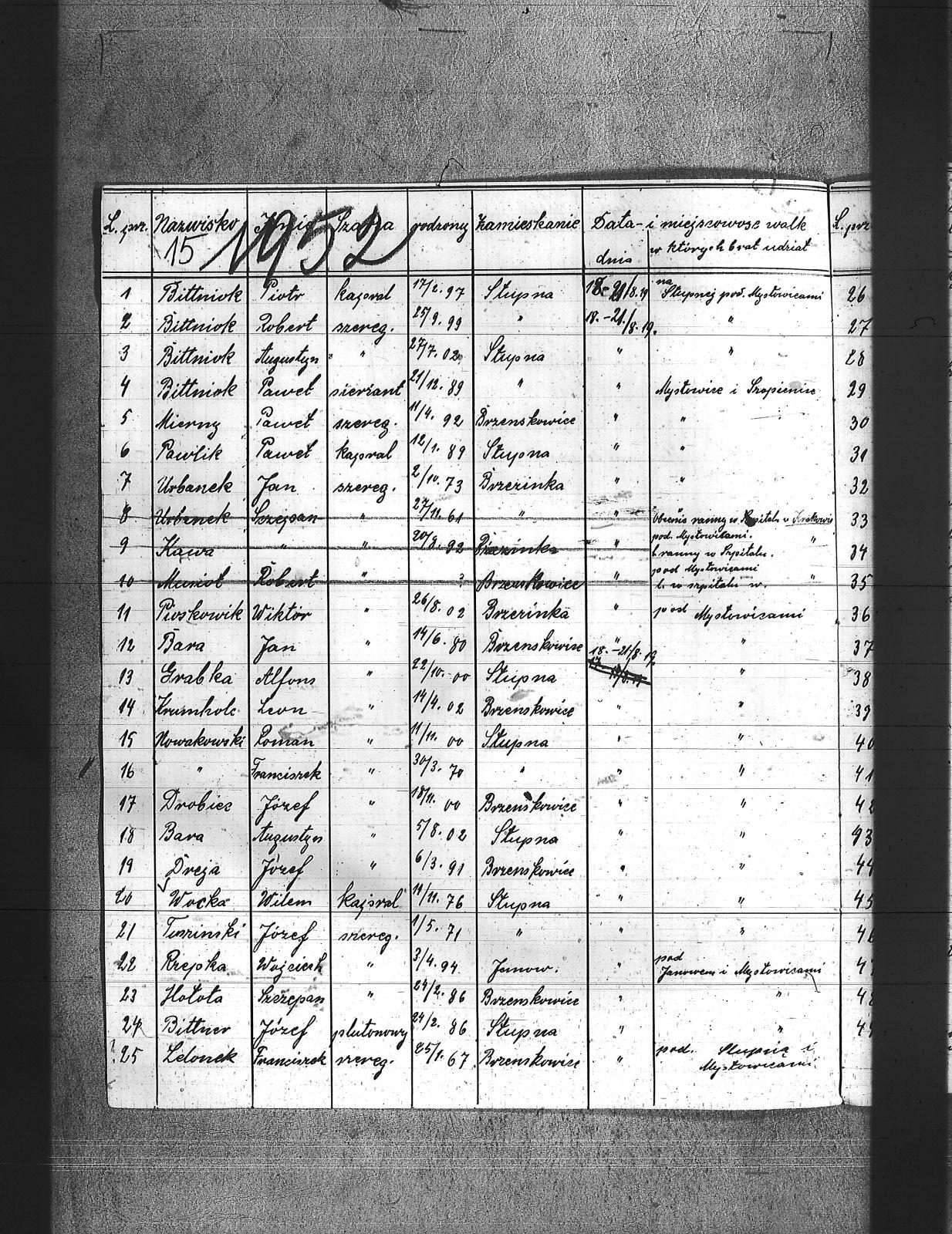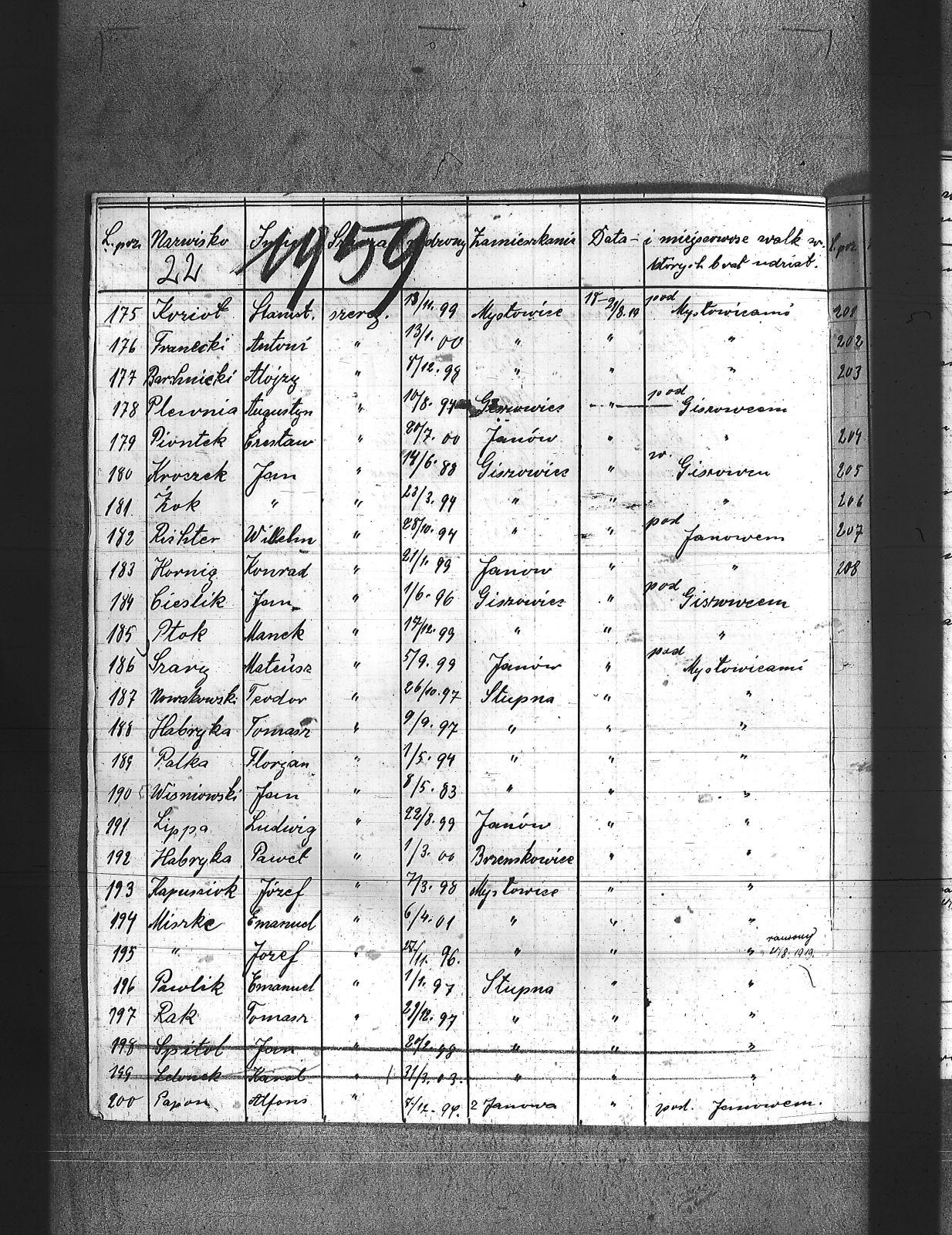 Balura, Jan; Bara, Augustyn; Bara, Jan; Barański, Jan; Barchnicki, Alojzy; Bednarek, Józef; Biecki, Fryderyk; Bittner, Józef; Bittniok, Augustyn; Bittniok, Paweł; Bittniok, Piotr; Bittniok, Robert; Bracik, Piotr; Buła, Jan; Cieślik, Jan; Czapla, Edward; Czapla, Wilem; Czypionka, Edward; Czypionka, Paweł; Danisz, Henryk; Deja, Paweł; Dejas, Stanisław; Depta, Jan; Długaj, Walenty; Dreja, Józef; Drobiec, Franciszek; Drobiec, Józef; Durzy, Augustyn; Dzimierski, Józef; Filak, Paweł; Filipek, Ludwik; Franecki, Antoni; Garus, Aloizy; Gądzik, Tomasz; Gepert, Tomasz; Goj, Filip; Goj, Jan; Goj, Wilhelm; Gołorz, Franciszek; Gołorz, Szczepan; Grabka, Alfons; Gwiazda, Aleksander; Gwóźdź, Augustyn; Habryka, Paweł; Habryka, Tomasz; Hahuła, Józef; Hainol, Jerzy; Halfar, Emil; Hassa, Konrad; Hedwig, Jan; Hedwig, Karol; Holewa, Wiktor; Hołota, Szczepan; Homańczyk, Karol; Hornig, Konrad; Janko, Emanuel; Janotta, Franciszek; Janotta, Józef; Jaroszek, Juliusz; Jelonek, Franciszek; Jurczyk, Jan; Kamieniosz, Jan; Kapuściok, Alojzy; Kapuściok, Franciszek; Kapuściok, Józef; Kawa, Franciszek; Kawa, Szczepan; Kontny, Tomasz; Koszyk, Franciszek; Koszyk, Konrad; Kotyrba, Paweł; Kotyrba, Wiktor; Kotzy, Wiktor; Kowalski, Franciszek; Kowalski, Jakób; Kozioł, Ignac; Kozioł, Jan; Kozioł, Stanisław; Kozub, Franciszek; Kozur, Jan; Krenzel, Franciszek; Kroczek, Jan; Krumholc, Leon; Krzykawski, Jan; Kubica, Franciszek; Kubica, Leopold; Kubica, Teofil; Kubica, Tomasz; Kulawik, Karol; Kulawik, Wiktor; Kurek, Jan; Laby, Józef; Langer, Wincenty; Lelonek, Franciszek; Lelonek, Karol; Lelonek, Wilem; Liber, Wiktor; Liber, Wilhelm; Lippa, Ludwik; Lorenz, Franciszek; Lorenz, Juliusz; Loska, Jan; Łucka, Józef; Mag., Maciej; Magdziorz, Aleksander; Magdziorz, Szczepan; Mago., Franciszek; Mamok, Franciszek; Mańka, Filip; Mańka, Ryszard; Maslorz, Franciszek; Mateja, Andrzej; Mateja, Franciszek; Mierny, Paweł; Miszke, Emanuel; Miszke, Józef; Mokry, Paweł; Mruczek, Robert; Mrukwa, Karol; Musioł, Robert; Nawrotek, Adam; Nojman, Wilem; Nowakowski, Antoni; Nowakowski, Franciszek; Nowakowski, Roman; Nowakowski, Teodor; Olsza, Rufin; Pakuła, Ignacy; Paleta, Jan; Palka, Florjan; Papon, Alfons; Papon, Edmund; Pawlik, Emanuel; Pawlik, Paweł; Piernikarczyk, Konrad; Pilorz, Józef; Piontek, Czesław; Pioskowik, Jan; Pioskowik, Wiktor; Plewnia, Augustyn; Potyka, Raimund; Ptok, Manek; Pustelnik, Jan; Rak, Tomasz; Rembacz, Robert; Rembacz, Teodor; Richter, Antoni; Richter, Wilhelm; Rotkegel, Jan; Ryszka, Wiktor; Rzepka, Wojciech; Siekaczek, Jan; Sikora, Alex; Sitko, Paweł; Skórok, Piotr; Skróbak, Teodor; Slązok, Jan; Sliwa, Piotr; Sładkowski, Alfred; Słota, Bronisław; Smuda, Juliusz; Smuda, Konrad; Sojka, Franciszek; Spitol, Jan; Staśka, Jan; Stęchły, Franciszek; Stokfisz, Ignacy; Styś, Aloizy; Styś, Józef; Sycha, Wilem; Szary, Mateusz; Szeja, Józef; Szlachcic, Karol; Szojda, Karol; Szwach, Jan; Szwaicok, Roman; Szwainoch, Teofil; Szyja, Paweł; Tomalla, Jan; Tomalla, Leopold; Tomanek, Augustyn; Tomasik, Jan; Tusziński, Józef; Urbanek, Jan; Urbanek, Szczepan; Wandziura, Józef; Waszek, Walenty; Wata, Bernard; Wieczorek, Paweł; Winiarski, Teofil; Wiśniowski, Jan; Wocka, Jerzy; Wocka, Wilem; Woiczik, Walenty; Wojcik, ; Wojtalewicz, Aloizy; Wojtalewicz, Jan; Wojtowicz, Teofil; Wolf, Paweł; Wosiński, Józef; Wrona, Franciszek; Wróbel, Augustyn; Wróbel, Michał; Wyleżoł, Karol; Zając, Karol; Zok, Jan; Żacki, Jan; Żołna, Franciszek; Żołna, Wiktor; |