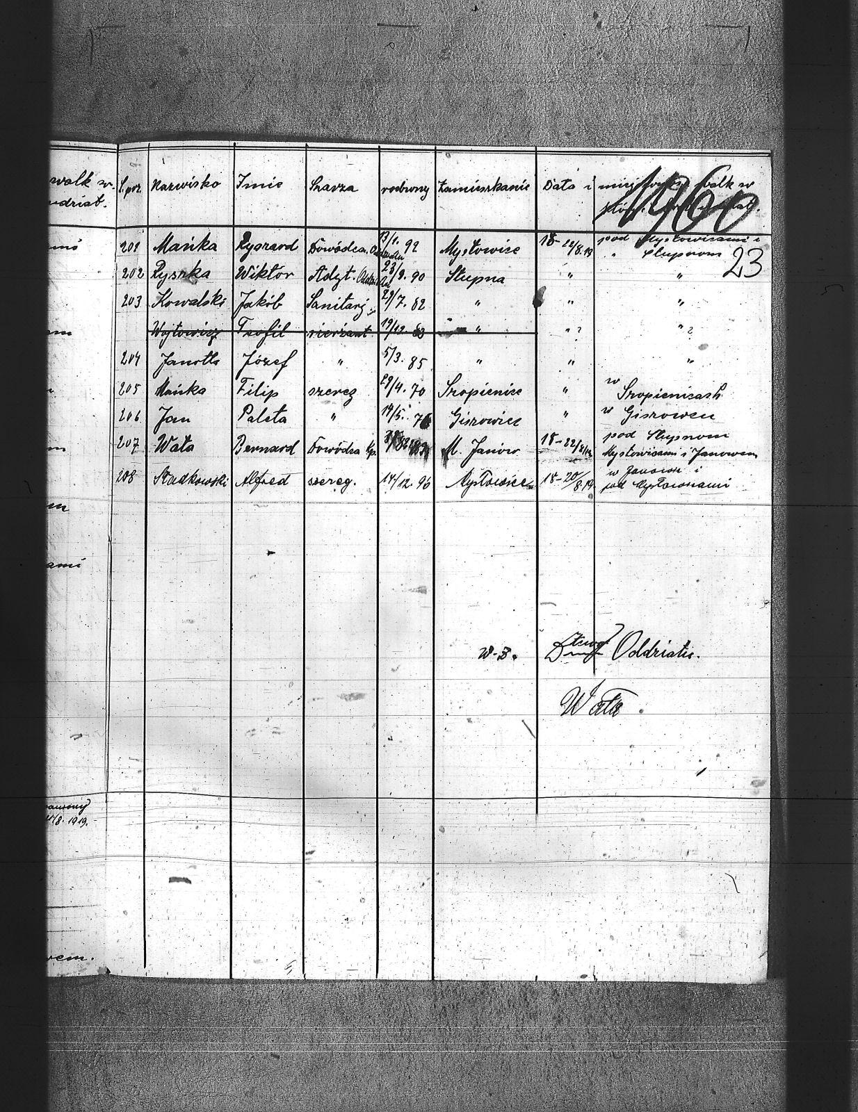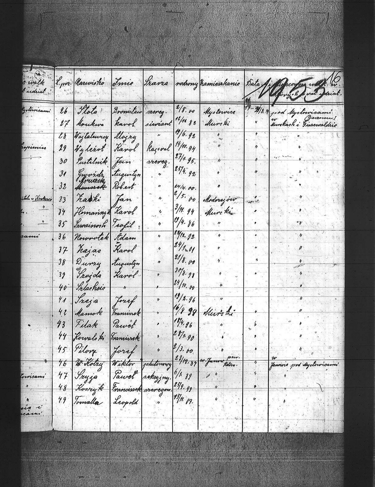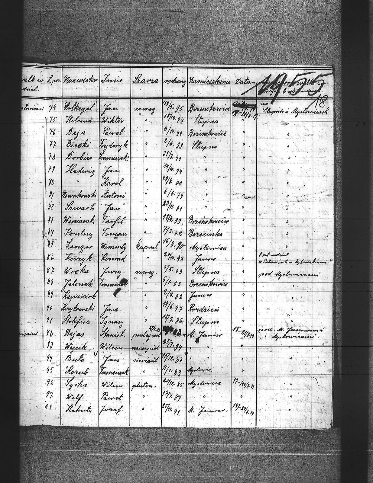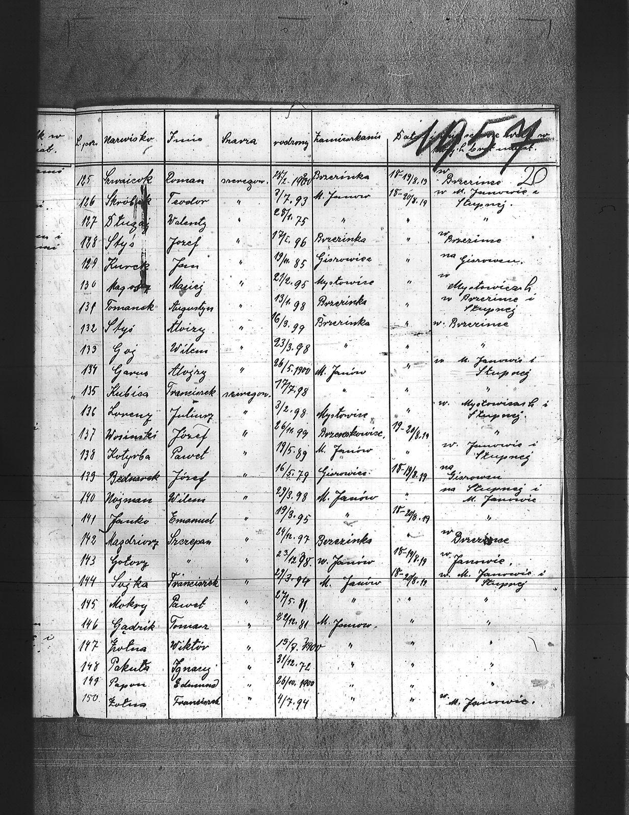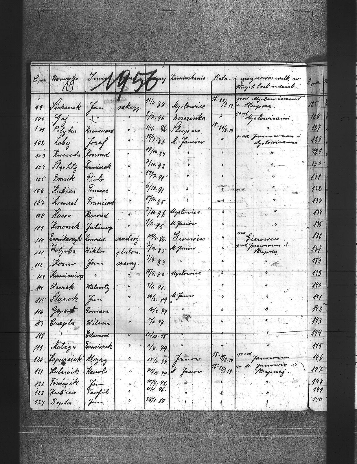 Balura, Jan; Bara, Augustyn; Bara, Jan; Barański, Jan; Barchnicki, Alojzy; Bednarek, Józef; Biecki, Fryderyk; Bittner, Józef; Bittniok, Augustyn; Bittniok, Paweł; Bittniok, Piotr; Bittniok, Robert; Bracik, Piotr; Buła, Jan; Cieślik, Jan; Czapla, Edward; Czapla, Wilem; Czypionka, Edward; Czypionka, Paweł; Danisz, Henryk; Deja, Paweł; Dejas, Stanisław; Depta, Jan; Długaj, Walenty; Dreja, Józef; Drobiec, Franciszek; Drobiec, Józef; Durzy, Augustyn; Dzimierski, Józef; Filak, Paweł; Filipek, Ludwik; Franecki, Antoni; Garus, Aloizy; Gądzik, Tomasz; Gepert, Tomasz; Goj, Filip; Goj, Jan; Goj, Wilhelm; Gołorz, Franciszek; Gołorz, Szczepan; Grabka, Alfons; Gwiazda, Aleksander; Gwóźdź, Augustyn; Habryka, Paweł; Habryka, Tomasz; Hahuła, Józef; Hainol, Jerzy; Halfar, Emil; Hassa, Konrad; Hedwig, Jan; Hedwig, Karol; Holewa, Wiktor; Hołota, Szczepan; Homańczyk, Karol; Hornig, Konrad; Janko, Emanuel; Janotta, Franciszek; Janotta, Józef; Jaroszek, Juliusz; Jelonek, Franciszek; Jurczyk, Jan; Kamieniosz, Jan; Kapuściok, Alojzy; Kapuściok, Franciszek; Kapuściok, Józef; Kawa, Franciszek; Kawa, Szczepan; Kontny, Tomasz; Koszyk, Franciszek; Koszyk, Konrad; Kotyrba, Paweł; Kotyrba, Wiktor; Kotzy, Wiktor; Kowalski, Franciszek; Kowalski, Jakób; Kozioł, Ignac; Kozioł, Jan; Kozioł, Stanisław; Kozub, Franciszek; Kozur, Jan; Krenzel, Franciszek; Kroczek, Jan; Krumholc, Leon; Krzykawski, Jan; Kubica, Franciszek; Kubica, Leopold; Kubica, Teofil; Kubica, Tomasz; Kulawik, Karol; Kulawik, Wiktor; Kurek, Jan; Laby, Józef; Langer, Wincenty; Lelonek, Franciszek; Lelonek, Karol; Lelonek, Wilem; Liber, Wiktor; Liber, Wilhelm; Lippa, Ludwik; Lorenz, Franciszek; Lorenz, Juliusz; Loska, Jan; Łucka, Józef; Mag., Maciej; Magdziorz, Aleksander; Magdziorz, Szczepan; Mago., Franciszek; Mamok, Franciszek; Mańka, Filip; Mańka, Ryszard; Maslorz, Franciszek; Mateja, Andrzej; Mateja, Franciszek; Mierny, Paweł; Miszke, Emanuel; Miszke, Józef; Mokry, Paweł; Mruczek, Robert; Mrukwa, Karol; Musioł, Robert; Nawrotek, Adam; Nojman, Wilem; Nowakowski, Antoni; Nowakowski, Franciszek; Nowakowski, Roman; Nowakowski, Teodor; Olsza, Rufin; Pakuła, Ignacy; Paleta, Jan; Palka, Florjan; Papon, Alfons; Papon, Edmund; Pawlik, Emanuel; Pawlik, Paweł; Piernikarczyk, Konrad; Pilorz, Józef; Piontek, Czesław; Pioskowik, Jan; Pioskowik, Wiktor; Plewnia, Augustyn; Potyka, Raimund; Ptok, Manek; Pustelnik, Jan; Rak, Tomasz; Rembacz, Robert; Rembacz, Teodor; Richter, Antoni; Richter, Wilhelm; Rotkegel, Jan; Ryszka, Wiktor; Rzepka, Wojciech; Siekaczek, Jan; Sikora, Alex; Sitko, Paweł; Skórok, Piotr; Skróbak, Teodor; Slązok, Jan; Sliwa, Piotr; Sładkowski, Alfred; Słota, Bronisław; Smuda, Juliusz; Smuda, Konrad; Sojka, Franciszek; Spitol, Jan; Staśka, Jan; Stęchły, Franciszek; Stokfisz, Ignacy; Styś, Aloizy; Styś, Józef; Sycha, Wilem; Szary, Mateusz; Szeja, Józef; Szlachcic, Karol; Szojda, Karol; Szwach, Jan; Szwaicok, Roman; Szwainoch, Teofil; Szyja, Paweł; Tomalla, Jan; Tomalla, Leopold; Tomanek, Augustyn; Tomasik, Jan; Tusziński, Józef; Urbanek, Jan; Urbanek, Szczepan; Wandziura, Józef; Waszek, Walenty; Wata, Bernard; Wieczorek, Paweł; Winiarski, Teofil; Wiśniowski, Jan; Wocka, Jerzy; Wocka, Wilem; Woiczik, Walenty; Wojcik, ; Wojtalewicz, Aloizy; Wojtalewicz, Jan; Wojtowicz, Teofil; Wolf, Paweł; Wosiński, Józef; Wrona, Franciszek; Wróbel, Augustyn; Wróbel, Michał; Wyleżoł, Karol; Zając, Karol; Zok, Jan; Żacki, Jan; Żołna, Franciszek; Żołna, Wiktor; |