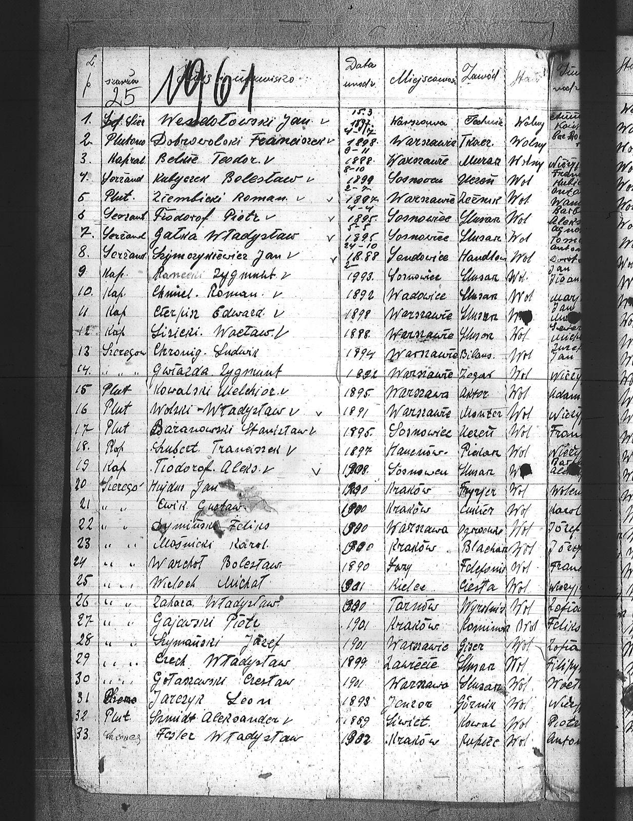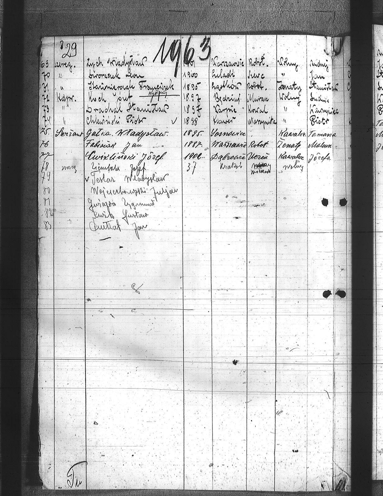 Baranowski, Stanisław; Bardziński, Jan; Batorski, Bogdan; Belric, Teodor; Bem, Edward; Białek, Ludwik; Bułat, Jan; Celler, Antoni; Chlewiński, Piotr; Chmiel, Roman; Chronig, Ludwik; Cierpisz, Edward; Ciplińśki, Stefan; Cwik, Gustaw; Cwikliński, Józef; Czech, Władysław; Czechowski, Jan; Dąbrowski, Feliks; Dobrowolski, Franciszek; Drachal, Stanisław; Dukod, Jan; Dworaczek, Leon; Dymiński, Feliks; Fabisiak, Jan; Fesler, Władysław; Fiodorof, Aleks; Fiodorof, Piotr; Frysztacki, Władysław; Gajewski, Piotr; Gałka, Władysław; Gałwa, Stanisław; Gołaszewski, Czesław; Gontkiewicz, Jan; Grym, Bogusław; Gwiazda, Zygmunt; Hujdus, Jan; Jańczyk, Piotr; Jarczyk, Leon; Jendraś, Piotr; Kaffel, Marcin; Karkuciński, Eugeniusz; Kazimierczak, Franciszek; Koch; Konalski, Feliks; Kowalski, Melchior; Kruk, Władysław; Kubyczek, Stanisław; Lenarczyk, Stefan; Lisicki, Wacław; Mieżejewski, Marjan; Mośnicki, Karol; Nawrocki, Ludwig; Ogłuch, Antoni; Ostrowski, Jan; Pacłakiewicz, Czesław; Piątek, Józef; Piotrowski, Zygmunt; Pluta, Antoni; Rancik, Zygmunt; Sołtysik, Tomasz; Suchacki, Aleksander; Szmidt, Aleksander; Szmidt, Stefan; Szubert, Franciszek; Szymański, Józef; Szymczykiewicz, Jan; Teslar, Władysław; Tyczkowski, Władysław; Warchoł, Bolesław; Wendołowski, Jan; Wieloch, Michał; Wierzbicki, Wacław; Wojciechowski, Julian; Wojciechowski, Juljan; Wolski, Władysław; Zahara, Władysław; Ziembala, Józef; Ziembicki, Roman; Ziembola, Józef; Zych, Franciszek; Zych, Władysław; |