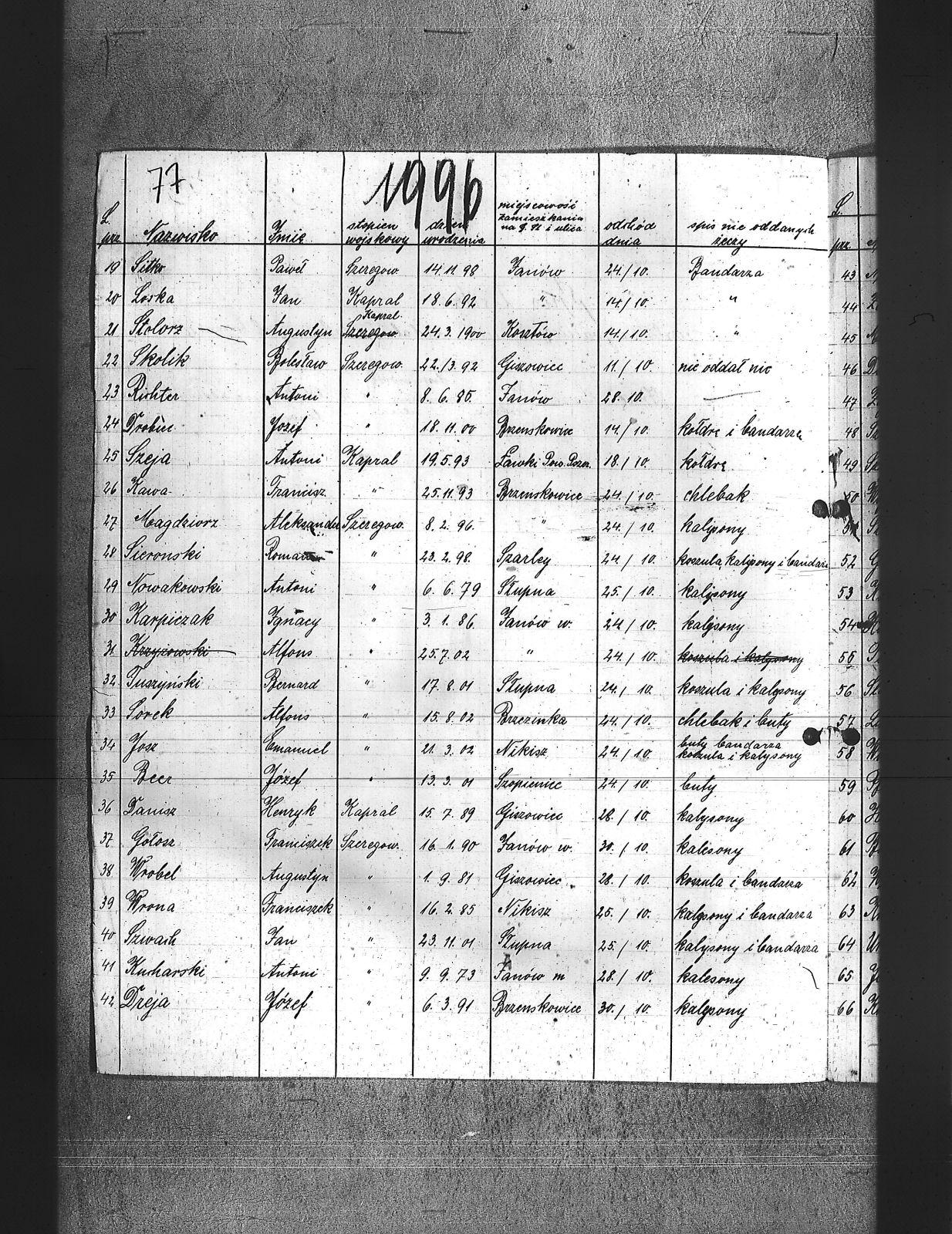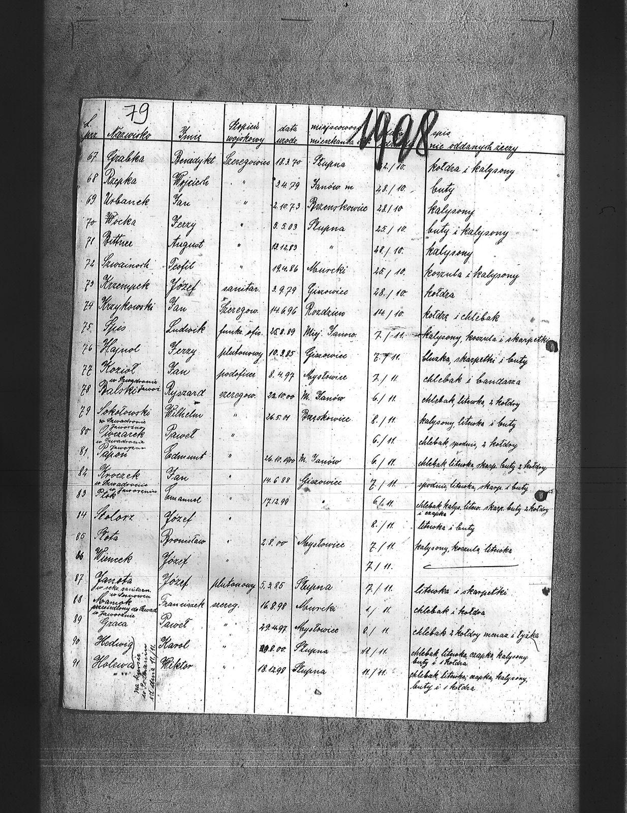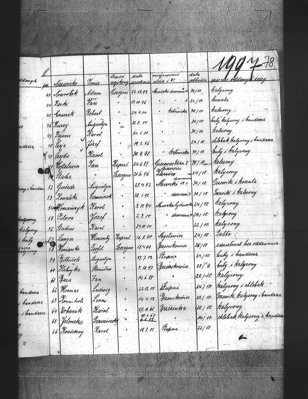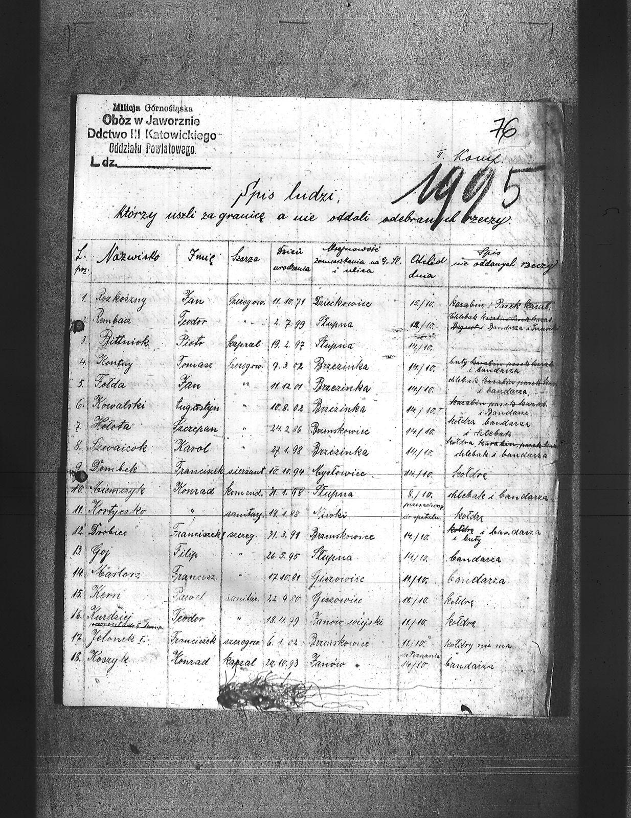 Baca, Jan; Balski, Ryszard; Becz, Józef; Bednarz, Jerzy; Bittner, August; Bittniok, Augustyn; Bittniok, Piotr; Boniecki, Henryk; Brajer, Ryszard; Brombosz, Jan; Bujok, Ignacy; Buzek, Wilhelm; Cok, Ludwik; Cyplicki, Stefan; Danek, Antoni; Danisz, Henryk; Dombek; Dombek, Franciszek; Dreja, Józef; Drobiec, Franciszek; Drobiec, Józef; Duczy, Augustyn; Dudek, Franciszek; Ekert, Józef; Falkus, Franciszek; Fołda, Jan; Gebaś, Stanisław; Goj, Filip; Gołosz, Franciszek; Góral, Franciszek; Górecki, Jan; Grabka, Benedykt; Graca, Paweł; Grella, Edward; Guzelski, Herman; Gwóźdź, Augustyn; Habryka, Stanisław; Hajnol, Jerzy; Hardy, Wilhelm; Hasnik, Ludwik; Hedwig, Karol; Holewa, Wiktor; Hołota, Szczepan; Homańczyk, Karol; Jagiełło, Franciszek; Janota, Józef; Jaworski, Tadeusz; Jelonek I, Franciszek; Jelonek, Franciszek; Jochymski, Karol; Josz, Emanuel; Juranczyk, Edmund; Jureczko, Aleksander; Karpiczak, Ignacy; Kawa, Franciszek; Kern, Piotr; Klanus, Jan; Konieczny, Karol; Kontny, Tomasz; Kortyczko, Konrad; Korzec, Ludwik; Koszyk, Konrad; Kowalski, Augustyn; Kowalski, Franciszek; Kozioł, Jan; Kroczek, Jan; Kroczek, Józef; Krunikow, Leon; Krzempek, Józef; Krzykała, Alojz; Krzykowski, Jan; Krzyżowski, Alfons; Kucharski, Antoni; Kurdziej, Teodor; Langer, Wincenty; Latusek; Ledwoń, Karol; Lipnicki, ; Lolek, Jerzy; Loska, Jan; Łosa, Jan; Magdziorz, Aleksander; Mamok, Franciszek; Marnecki, August; Maslorz, Franciszek; Mruczek, Robert; Musiał, Klemens; Nawrat, Jan; Nawrot, Józef; Niemczyk, Konrad; Nizler, Paweł; Nowakowski, Antoni; Nowrotek, Adam; Owczarek, Paweł; Papoń, Edmunt; Paprotny, Aleksander; Pardela, Hugo; Patałąk, E.; Pila, Gustaw; Pilorz, Jóżef; Ptok, Emanuel; Ratka, Alojzy; Rembacz, Teodor; Richter, Antoni; Roszak, Józef; Rozkoszny, Jan; Rzepka, Józef; Rzepka, Wojcich; Rzepus, Jan; Sieronski, Roman; Sitko, Paweł; Skipioł, Józef; Skolik, Bolesław; Slachcic, Karol; Sledziarczyk; Słabiński, Walenty; Słota, Bronisław; Sok, Ludwik; Sokołowski, Wilhelm; Sorek, Alfons; Spis, Ludwik; Staika, Jan; Stanisławski, Stanisław; Stokosa, Ferdynand; Stokosa, Teodor; Stolorz, Augustyn; Stolorz, Józef; Storz, Józef; Szafarczyk, Jan; Szczurek, August; Szczyrba, Karol; Szeja, Antoni; Szeja, Józef; Szkorski, Jan; Szojda, Karol; Szustak, Franciszek; Szwaicok, Karol; Szwaik, Jan; Szwainoch, Teofil; Szymański, Henryk; Tomala, Jan; Tuszyński, Bernard; Urbanek, Jan; Urbanek, Karol; Waluga, Jan; Wieczorek; Wiencek, Józef; Winiarski, Teofil; Wocka, Jerzy; Wojtalewicz, Jan; Wrona, Franciszek; Wrona, Ludwik; Wróbel, Augustyn; Wybraniec, Wilhelm; Zajonc, Karol; Zielera, Kornel; Zieliński, Walenty; Zycha, Piotr; Żacki, Jan; |