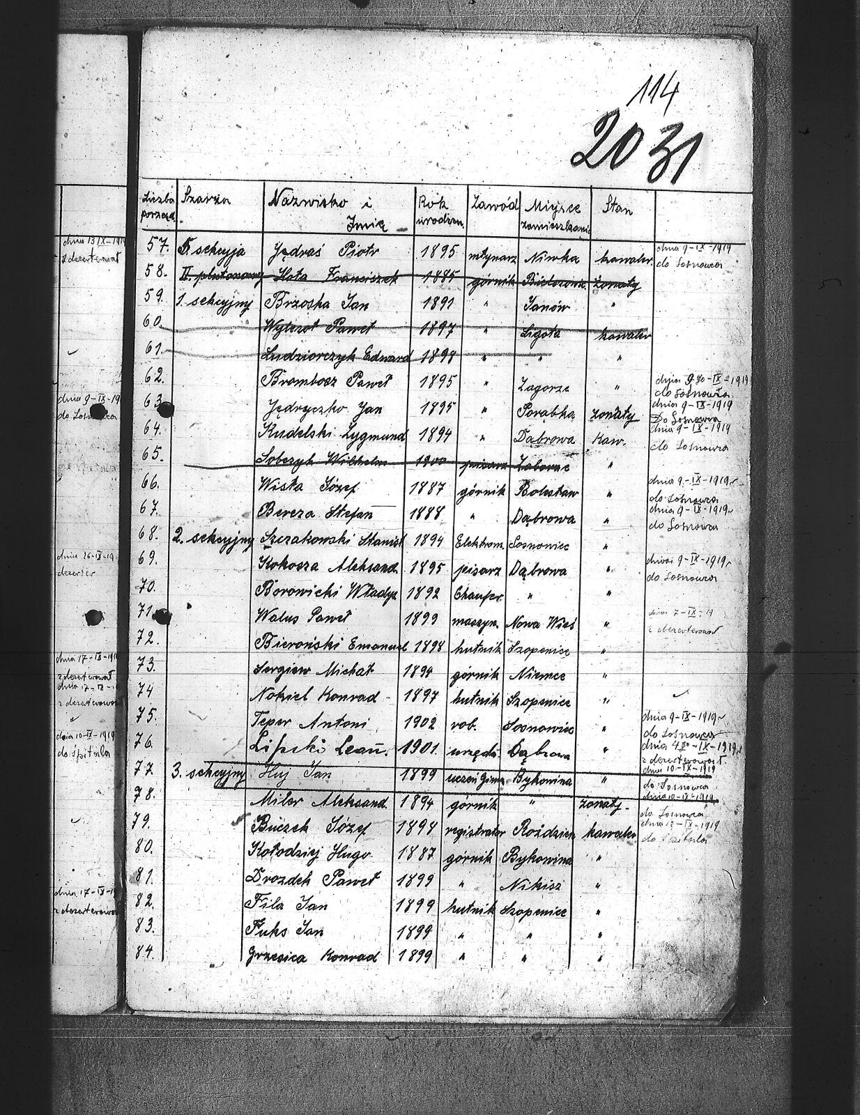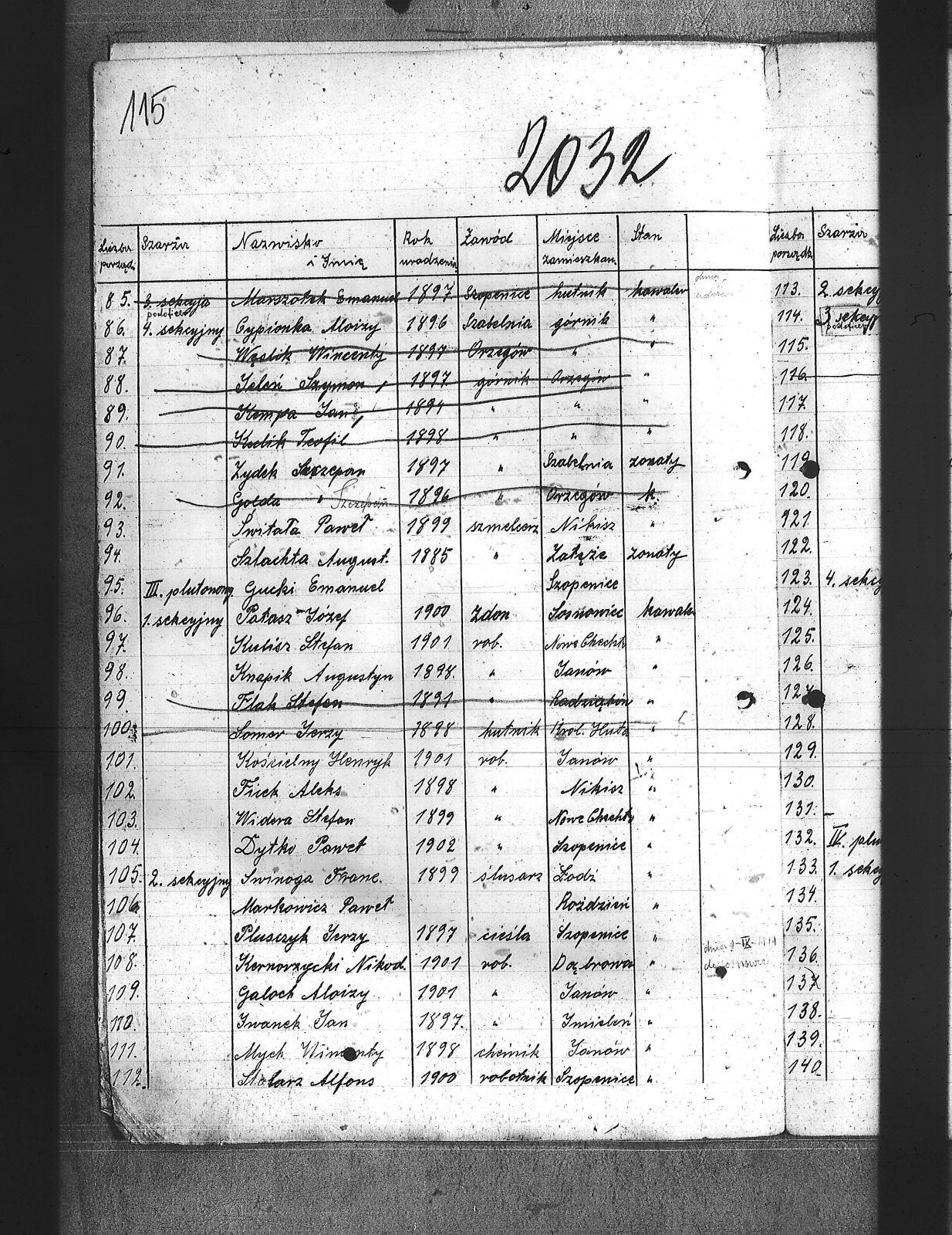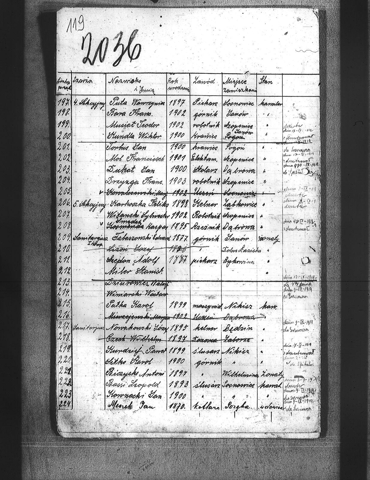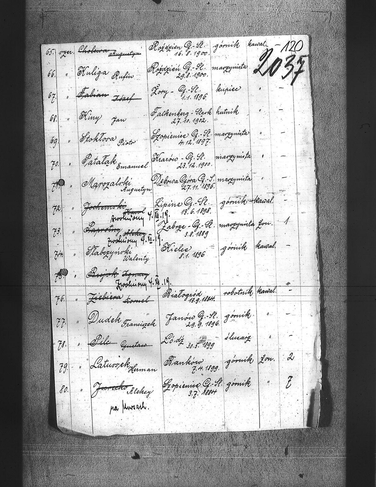 Adamski, Józef; Badura, Walenty; Baloń, Jan; Balski, Jan; Bara, Franciszek; Barański, Józef; Bartel, Zygfryd; Bartoszek, Teofil; Bassi, Leopold; Bereza, Stefan; Białoń, Bernard; Biczysko, Antoni; Bieroński, Emanuel; Blok, Marjan; Bombelka, Józef; Borowicki, Władysław; Brombosz, Paweł; Brzoska, Jan; Buczek, Józef; Bujok, Ignacy; Bula, Franciszek; Cabończyk, Hubert; Chachuła, Edward; Chechelski, Józef; Chmura, August; Cholewa, Augustyn; Chrobok, Karol; Cyba, Franciszek; Cypionka, Aloizy; Czech, Wilhelm; Czechowski, Jan; Dłubis, Franciszek; Drozdek, Jan; Drozdek, Paweł; Dróżdż, Jan; Drzyzga, Franciszek; Dudek, Franciszek; Dukat, Jan; Duszek, August; Dworak, Dominik; Dyga, Franciszek; Dytko, Paweł; Dziemba, Teodor; Dziurowicz, Walery; Fabian, Józef; Fatela, Jan; Ficek, Aleks; Figura, Józef; Fila, Jan; Flak, Stefan; Fudała, Rudolf; Fuks, Jan; Fuks, Konrad; Gadomski, Jerzy; Galoch, Aloizy; Gałuszka, Jan; Gatner, Wilhelm; Golda, Szczepan; Gondzik, Józef; Grzesica, Konrad; Gucki, Emanuel; Gwóźdź, Jan; Habryka, Franciszek; Hermanowski, Władysław; Hofman, Józef; Hornich, Ireneusz; Huj, Jan; Iwanek, Jan; Janota, Paweł; Jeleń, Szymon; Jędraś, Piotr; Jędryczko, Jan; Jochemski, Karol; Jurecko, Aleksy; Karkoszka, Feliks; Kciuk, Nikodem; Kempa, Jan; Kiny, Jan; Kita, Stanisław; Klein, Aloizy; Klik, Alfred; Klimas, Tomasz; Klimczak, Antoni; Klimek, Jan; Klisz, Franciszek; Knapik, Antoni; Knapik, Augustyn; Knieja, Aleksander; Kokosza, Aleksander; Kołodziej, Hugo; Kornorzycki, Nikodem; Kościelny, Henryk; Kota, Franciszek; Kowalczewski, Marjan; Kowalski, Aloizy; Kowalski, Franciszek; Kownacki, Jan; Koza, Andrzej; Krystolik, Wincent; Ksiądz, Konrad; Kubik, Teofil; Kucia, Aloizy; Kucowicz, Jan; Kudelski, Zygmund; Kuliga, Rufin; Kulisz, Stefan; Kundla, Wiktor; Kurdziej, Paweł; Kuropatwiński, Jan; Kusek, Józef; Kuszka, Edmund; Kuźma, Paweł; Latuszek, Herman; Lipski, Leon; Lizoń, Józef; Lizoń, Teodor; Ludziorczyk, Edward; Łabuś, Henryk; Marchewka, Paweł; Markowicz, Paweł; Maroń, Piotr; Marszalski, Augustyn; Marszołek, Emanuel; Marzec, Józef; Maślorz, Karol; Meszek, Jan; Miernik, Józef; Mierzejewski, Marjan; Miler, Aleksander; Miler, Stanisław; Mogiła, Władysław; Mol, Franciszek; Morta, Antoni; Mozek, Alojzy; Mozek, Jan; Mucha, Józef; Musialik, Paweł; Musiał, Teodor; Mych, Wimcenty; Nasiorowski, Kazimierz; Nibis, Józef; Niesyto, Emanuel; Niewiak, Ludwik; Nokiel, Konrad; Nowakowski, Józef; Ogudek, Antoni; Oldyński, Zdzisław; Oleksiak, Wincenty; Oleś, Jan; Ostrowski, Zbigniew; Otrębski, Marian; Pałasz, Józef; Pałka, Karol; Panis, Alojzy; Paprotny, Aleksy; Parusiewicz, Stanisław; Paszkowski; Patałąk, Emanuel; Pelszyk, Józef; Pękała, Franciszek; Piesiur, Aloizy; Pietrzyk, Bolesław; Piętka, Stanisław; Pilc, Gustaw; Plusczyk, Jerzy; Pluta, Jóżef; Postrach; Puta, Wawrzyniec; Pypłacz, Alfons; Pyrtek, Stanisław; Pyrtek, Wilhelm; Ramisz, August; Rojewski, Jan; Sergiew, Michał; Sitko, Karol; Siwek, Wilhelm; Siwiec, Jan; Słabczyński, Walenty; Smędek, Kasper; Sobczvk, Wilhelm; Sobisz, Karol; Sołtysik, Konrad; Somer, Jerzy; Sosna, Teofil; Stokłosa, Piotr; Stolarz, Alfons; Stryjewski, Henryk; Swinoga, Franciszek; Synowic, Emanuel; Szczakowski, Stanisław; Szczepanek, Jan; Szczęsny, Wilhelm; Szejdon, Adolf; Szlachta, August; Szostek, Ludwik; Szymura, Konstanty; świtała, Paweł; Tabaszowski, Edward; Teper, Antoni; Torbus, Jan; Torgowski, Adam; Ulman, August; Ulman, Wilhelm; Walter; Walus, Paweł; Waszek, Konrad; Wąslik, Wincenty; Wdowiak, Leon; Widera, Stefan; Wieczorek, Jan; Wieczorek, Jerzy; Wilczek, Paweł; Wilczek, Szczepan; Wilk, Wiktor; Winczowski, Ryszard; Winiarski, Wacław; Winkler, Ryszard; Wista, Józef; Wiśniewski; Witanski, Sylwester; Wojcik, Walenty; Wostal, Paweł; Woźnicka, Edmund; Wójcik, Jakób; Wrona, Stefan; Wroński, Wiktor; Wyleżoł, Paweł; Wyrwa, Jan; Zabłocki, Rafał; Zasadziński, Czesław; Zbijewski; Zgryzek, Piotr; Ziebiera, Kornel; Zieliński, Józef; Zioła, Władysław; Ziora, Józef; Zok, Józef; Zuch, Feliks; Zydek, Szczepan; |
