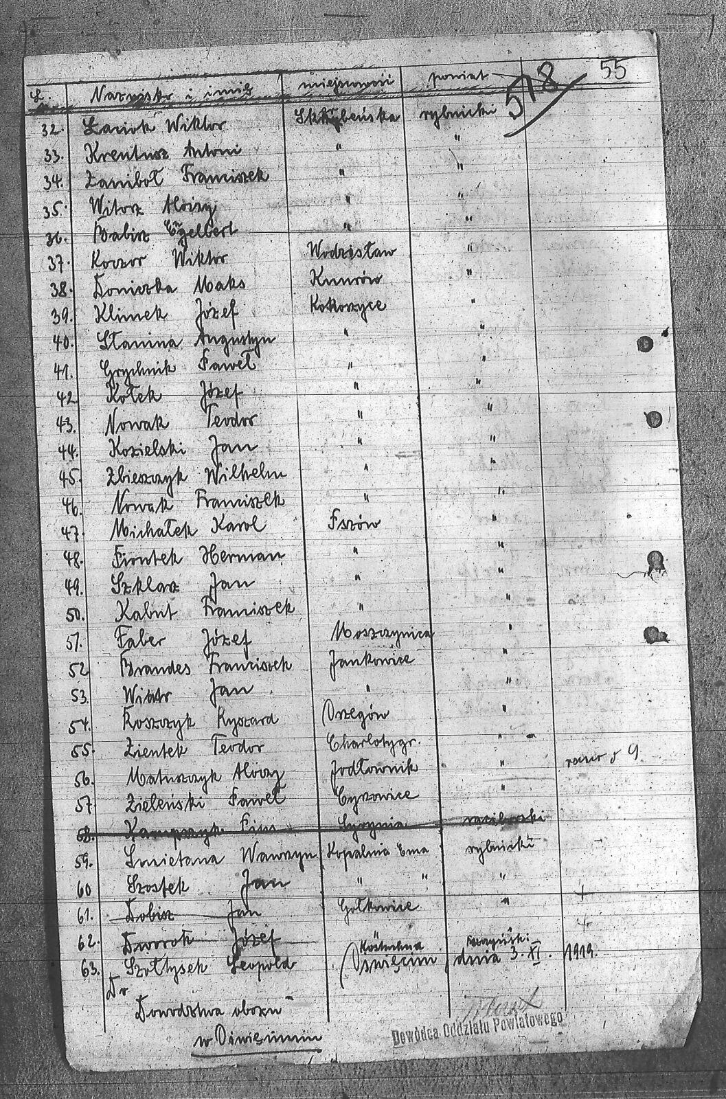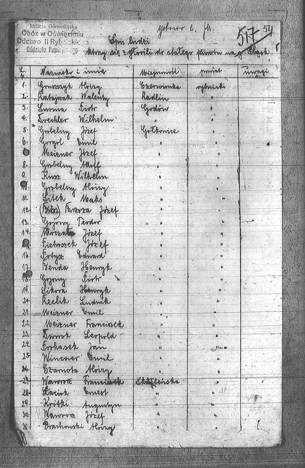 [nieczytelne], Józef; Babisz, Engelbert; Benda, Henryk; Brandes, Franciszek; Brzoza, Józef; Czarnota, Aloizy; Doniczka, Maks; Drechler, Wilhelm; Dworok, Leopold; Faber, Józef; Gojowy, Piotr; Gojowy, Teodor; Gorgol, Emil; Grobelny, Adolf; Grobelny, Aloizy; Grobelny, Józef; Gruszczyk, Aloizy; Grychnik, Paweł; Kabut, Franciszek; Klimek, Józef; Koczor, Wiktor; Kołek, Józef; Kozielski, Jan; Krentusz, Antoni; Krótki, Augustyn; Kusz, Wilhelm; Łaciok, Ernest; Łaciok, Wiktor; Matuszczyk, Aloizy; Meizner, Emil; Meizner, Franciszek; Meizner, Józef; Michałek, Karol; Nowak, Franciszek; Nowak, Teodor; Pietraszek, Jozef; Piontek, Herman; Potysz, Edward; Prachowski, Aloizy; Prohasek, Jan; Ratajczak, Walenty; Reclik, Ludwik; Roszczyk, Ryszard; Sikora, Henryk; Sitek, Maks; Słanina, Augustyn; Smietana, Wawrzyn; Surma, Piotr; Szklarz, Jan; Szołtysek, Leopold; Szostek, Jan; Wawrorz, Franciszek; Wawrorz, Józef; Wiatr, Jan; Wincner, Emil; Witorz, Aloizy; Zaniboł, Franciszek; Zbieszczyk, Wilhelm; Zielenski, Paweł; Zientek, Teodor; |