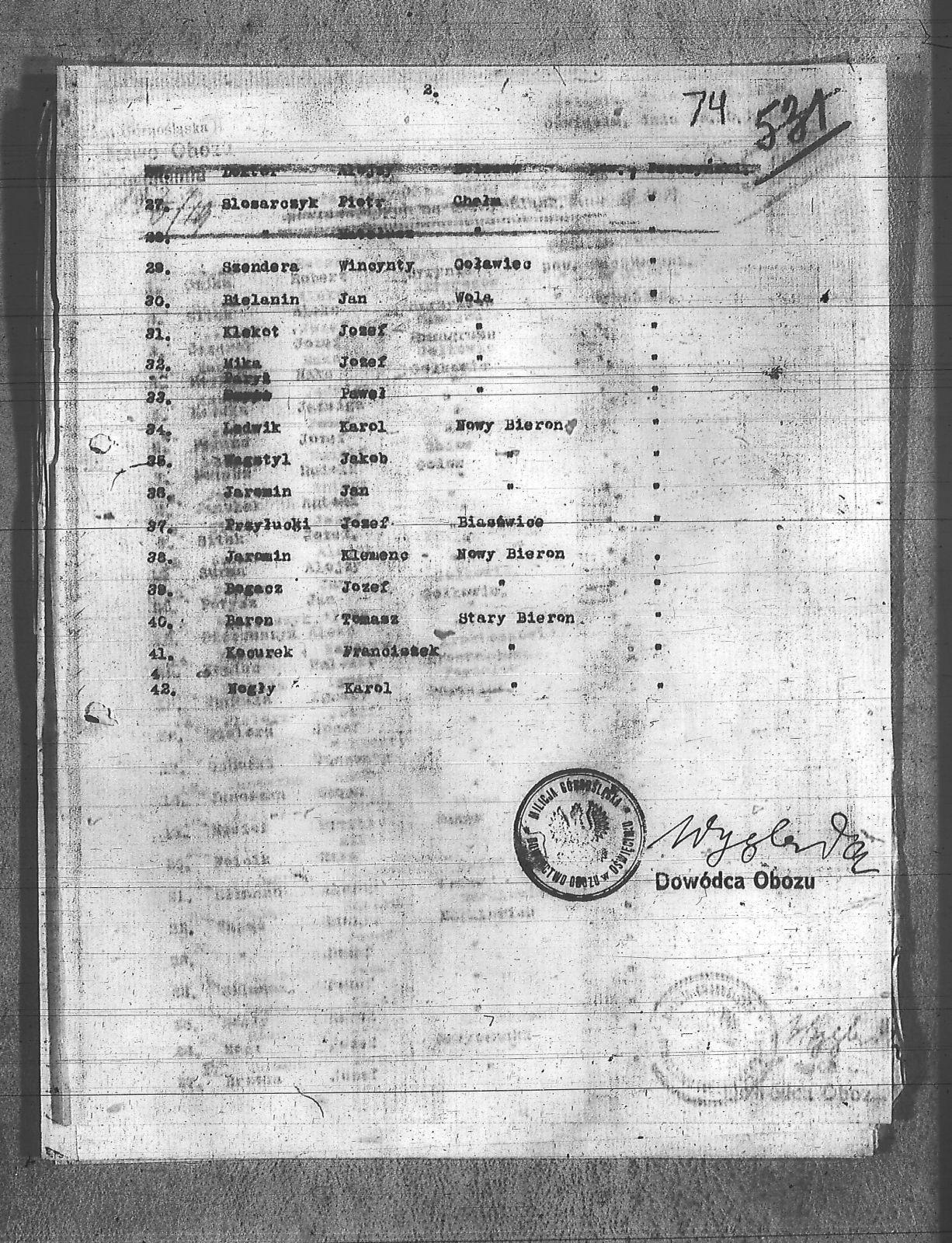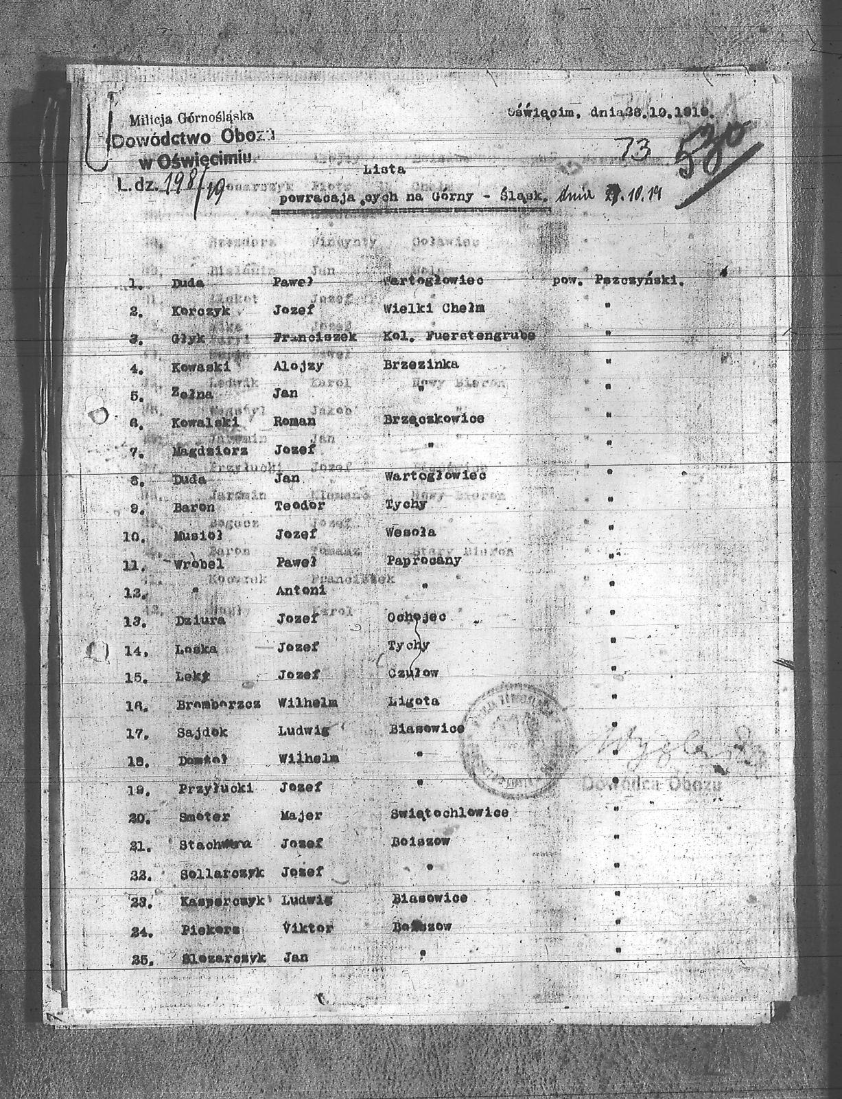 Baron, Teodor; Baron, Tomasz; Bielanin, Jan; Bogacz, Józef; Bromborzcz, Wilhelm; Doktor, Aloizy; Domżoł, Wilhelm; Duda, Jan; Duda, Paweł; Dziura, Józef; Głyk, Franciszek; Jaromin, Jan; Jaromin, Klemenc; Kasperczyk, Ludwik; Klekot, Józef; Kocurek, Franciszek; Korczyk, Józef; Kowalski, Roman; Kowaski, Alojzy; Leks, Józef; Loska, Józef; Ludwik, Karol; Magdziorz, Józef; Mika, Józef; Musioł, Józef; Nogły, Karol; Paryż, Paweł; Piekorz, Viktor; Przyłucki, Józef; Sajdok, Ludwik; Slosarczyk, Mateusz; Slosarczyk, Piotr; Slozarczyk, Jan; Smoter, Majer; Sollarczyk, Józef; Stachwera, Józef; Szendera, Wincenty; Wakstyl, Jakób; Wróbel, Antoni; Wróbel, Paweł; Zełna, Jan; |