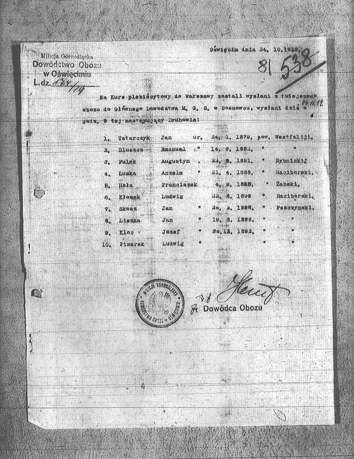 | Tytuł | Spis ludzi, którzy zostali wysłani na kurs plebiscytowy do Warszawy dnia 24 listopada 1919r. |