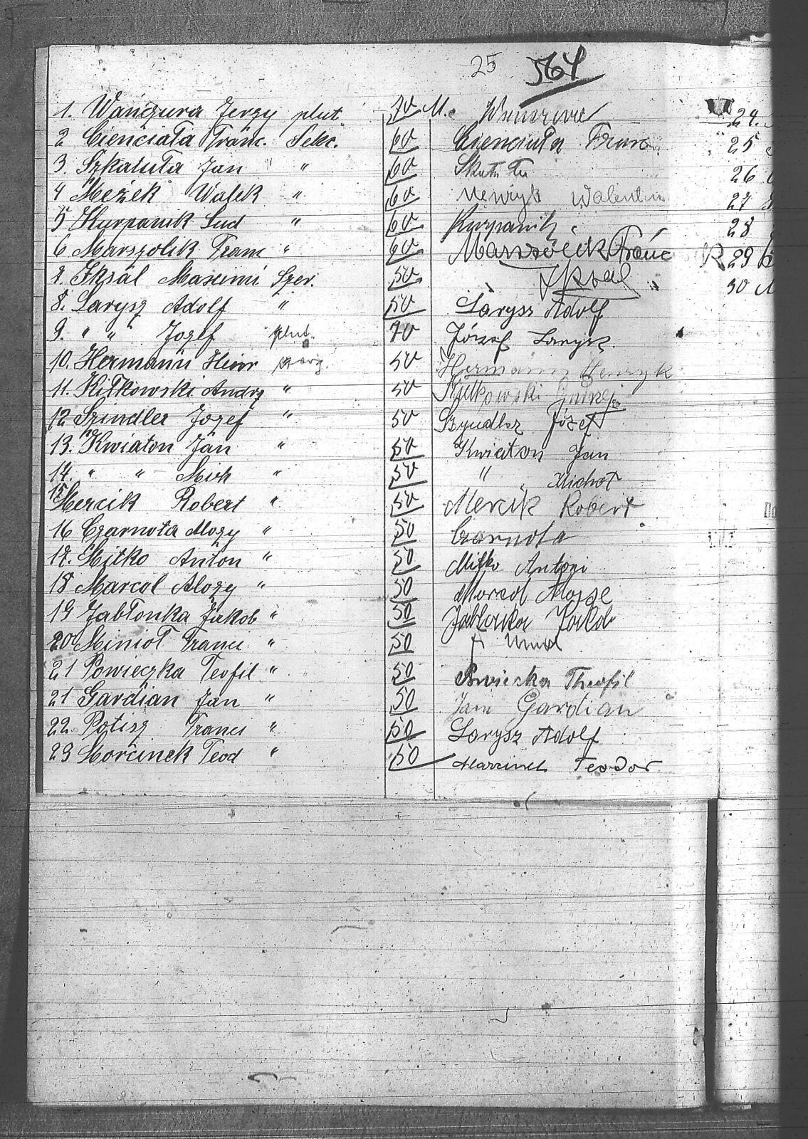 Cienciała, Franciszek; Czarnota, Alojzy; Gardian, Jan; Glenz, Karol; Góralczyk, Florian; Hermann, Henryk; Iksal, Maksymilian; Jabłonka, Jakub; Jakubczyk, Józef; Kłosek, Alojzy; Kułkowski, Andrzej; Kurpanik, Ludwik; Kwiaton, Jan; Kwiaton, Michał; Larysz, Adolf; Larysz, Józef; Marcel, Alojzy; Marszolik, Franciszek; Masłowski, Jan; Mercik, Robert; Meżek, Walenty; Minioł, Franciszek; Mitko, Antoni; Morcinek, Teodor; Oleś, Franciszek; Potisz, Franciszek; Powieczka, Teofil; Salamon, Jan; Szkatuła, Jan; Szyndler, Józef; Wańczura, Jerzy; |