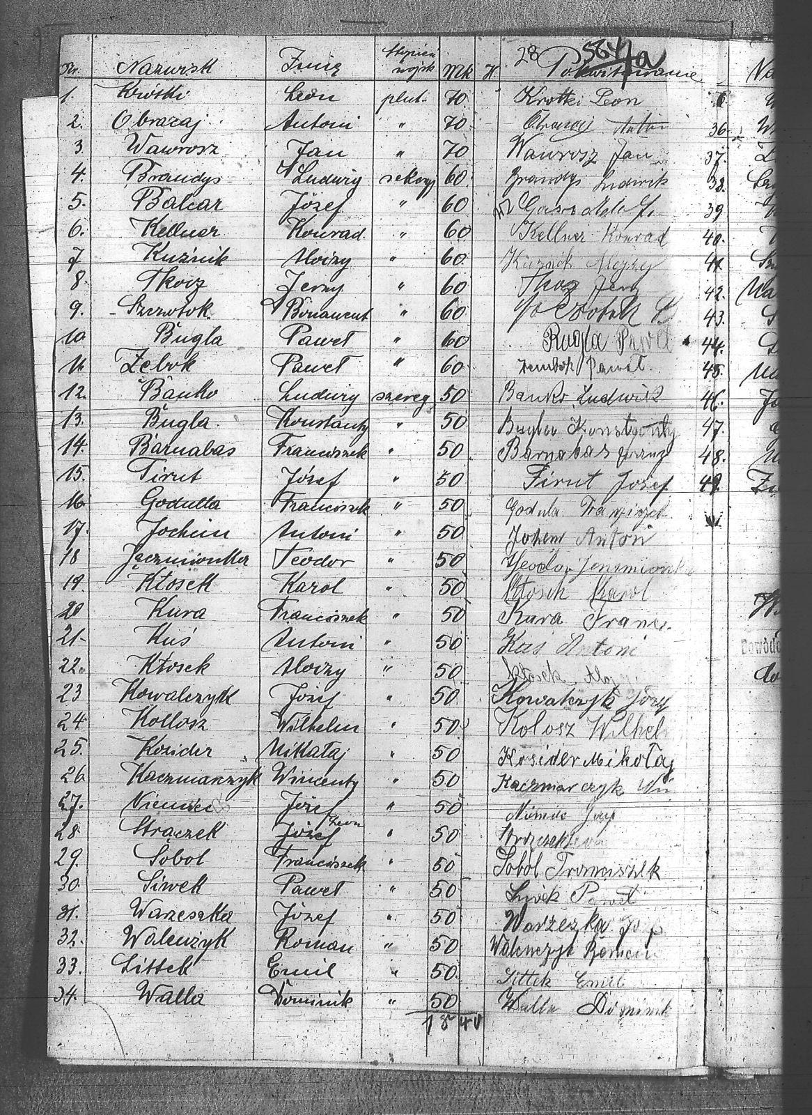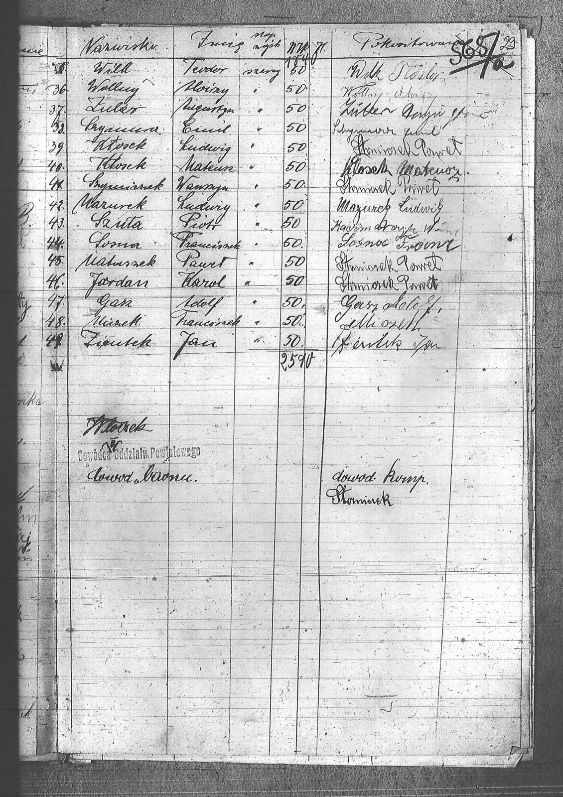 [Bakaz], Józef; Banko, Ludwig; Barnabas, Franciszek; Brandys, Ludwik; Bugla, Konstanty; Bugla, Paweł; Gasz, Adolf; Godulla, Franciszek; Jęczmionka, Teodor; Jochein, Antoni; Jordan, Karol; Kaczmarczyk, Wincenty; Kellner, Konrad; Kłosek, Alojzy; Kłosek, Karol; Kłosek, Ludwik; Kłosek, Mateusz; Kolosz, Wilhelm; Kowalczyk, Józef; Kozider, Mikołaj; Krótki, Leon; Kura, Franciszek; Kuś, Antoni; Kuźnik, Alojzy; Matuszek, Paweł; Mazurek, Ludwig; Miczek, Franciszek; Niemiec, Józef; Obracaj, Antoni; Sittek, Emil; Siwek, Paweł; Sobol, Franciszek; Sosna, Franciszek; Strączek, Leon; Szczotok, Bonawent; Szuła, Piotr; Szymiczek, Wawrzyn; Szymura, Emil; Tirut, Józef; Tkacz, Jerzy; Waleńczyk, Roman; Walla, Dominik; Warzeszka, Józef; Wawrosz, Jan; Wilk, Teodor; Wollny, Alojzy; Zebok, Paweł; Zientek, Jan; Zuber, Augustyn; |