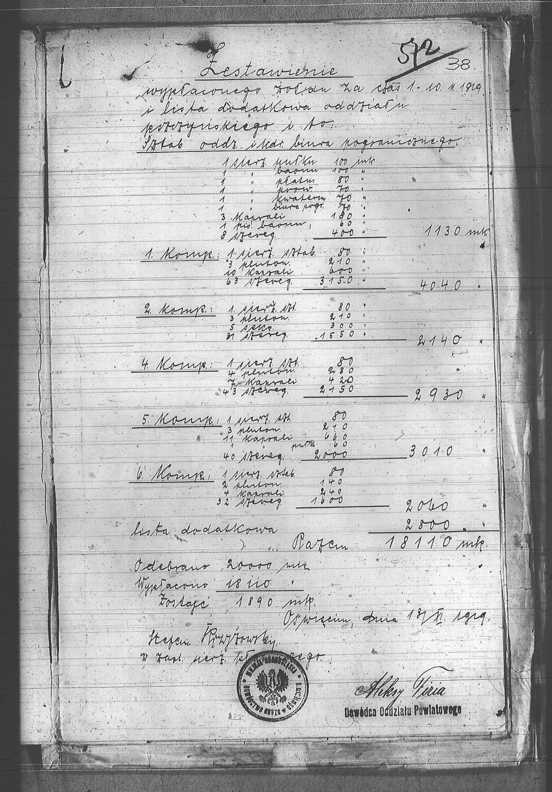 Tytuł Zestawienie wypłaconego żołdu 1-10 listopad 1919r.