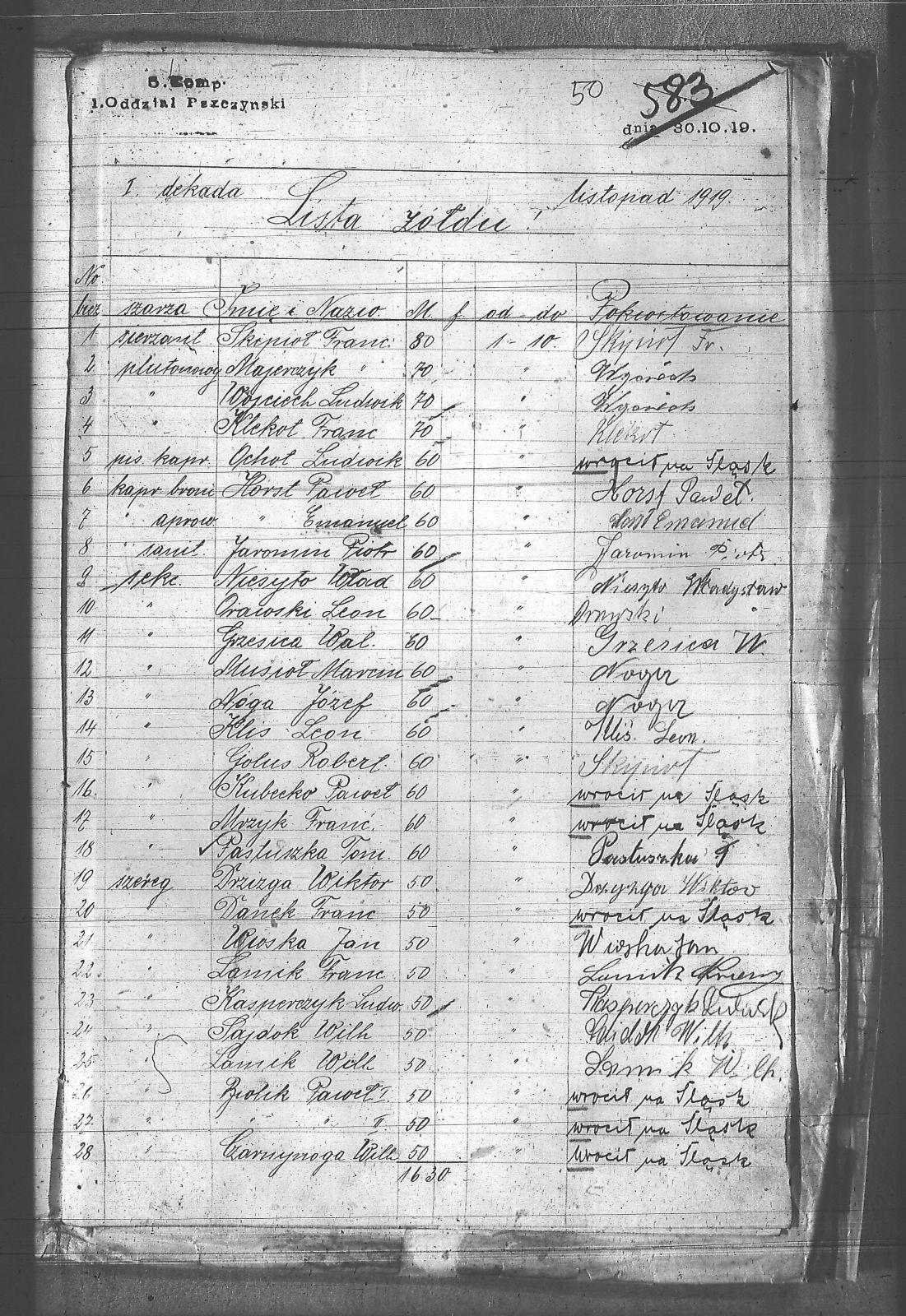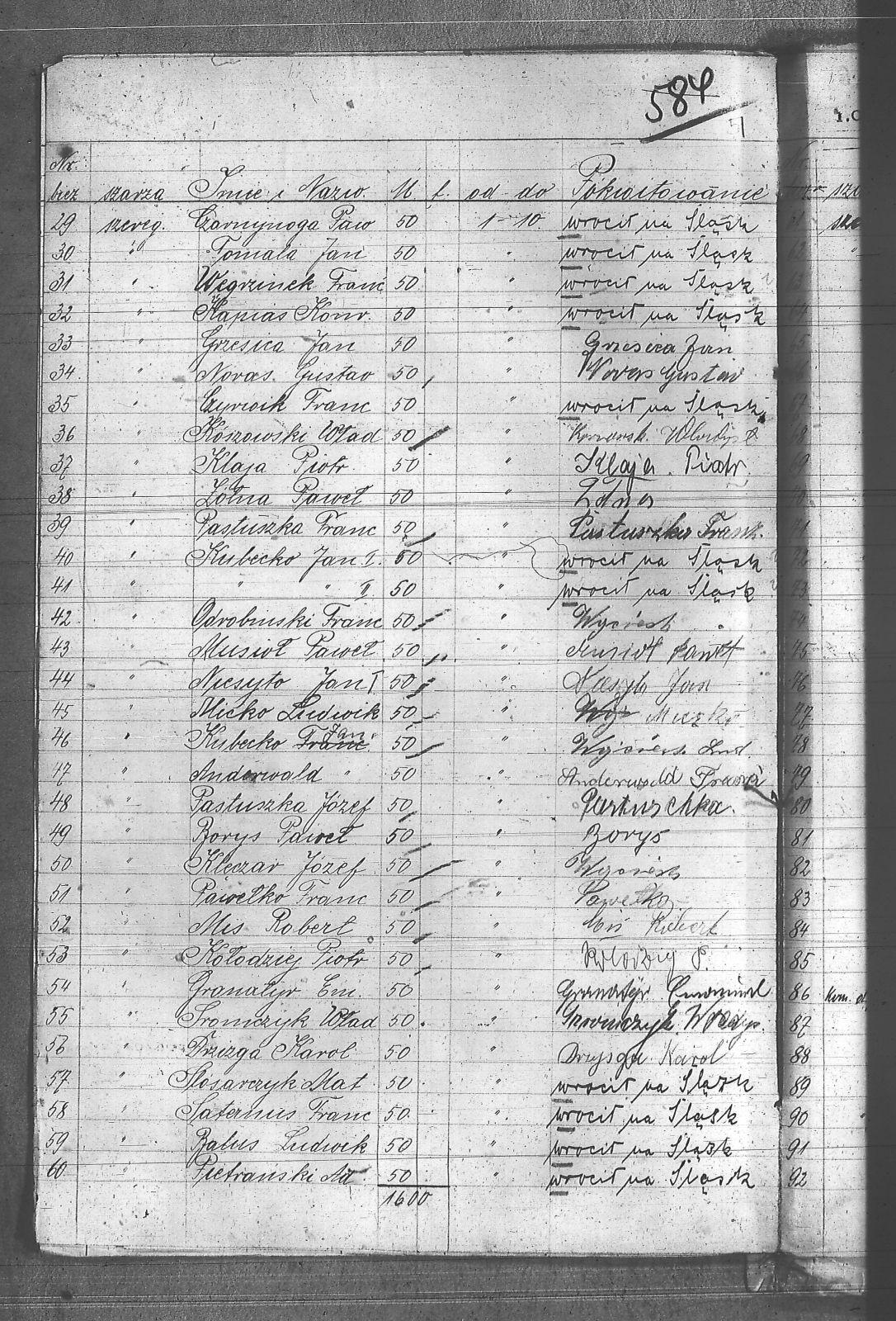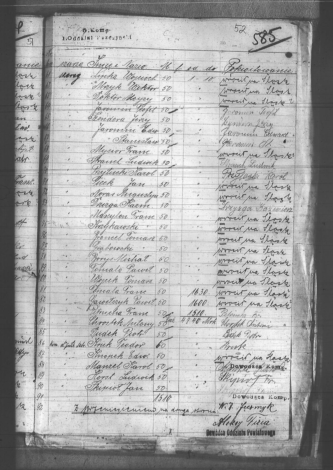 [Anderwald], Franciszek; [Jeczmyk], W.J.; Balus, Ludwik; Biolik, Paweł I; Biolik, Paweł II; Borys, Michał; Borys, Paweł; Broncel, Tomasz; Chrostek, Antoni; Czarnynoga, Paweł; Czarnynoga, Wilhelm; Czyrwik, Franciszek; Danek, Franciszek; Doktór, Alojzy; Drzizga, Karol; Drzizga, Kazimierz; Drzizga, Wiktor; Dudek, Piotr; Ficek, Jan; Fizia, Aleksy; Golus, Robert; Grabowski, Tomasz; Gronatyr, Emanuel; Grzesica, Jan; Grzesica, Waldemar; Horst, Emanuel; Horst, Ludwik; Horst, Paweł; Jaromin, Edward; Jaromin, Piotr; Jaromin, Stanisław; Jaromin, Teofil; Kapias, Konrad; Kasperczyk, Ludwik; Klaja, Piotr; Kleczar, Józef; Klekot, Franciszek; Klis, Leon; Knopek, Edward; Kołodziej, Piotr; Koszowski, Władysław; Kruk, Teodor; Krzykowski, Franciszek; Krzyzowski, Stefan; Kubecko, Jan; Kubecko, Jan I; Kubecko, Jan II; Kubecko, Paweł; Lamik, Jan; Lamik, Wilhelm; Lipka, Wojciech; Majerczyk, Franciszek; Maksylon, Franciszek; Manzel, Karol; Micko, Ludwik; Mis, Robert; Mrzyk, Franciszek; Mrzyk, Wiktor; Musioł, Marcin; Musioł, Paweł; Mysior, Franciszek; Niesyto, Jan; Niesyto, Władysław; Noga, Józef; Noras, Augustyn; Noras, Gustaw; Ochot, Ludwik; Odrobinski, Franciszek; Orawski, Leon; Pajdok, Wilhelm; Pastuszka, Franciszek; Pastuszka, Józef; Pastuszka, Tomasz; Pawełczyk, Paweł; Pawełko, Franciszek; Pietranski, Adam; Przyłucki, Karol; Pstrucha, Franciszek; Saternus, Franciszek; Skipiał, Franciszek; Skipioł, Jan; Slósarczyk, Mateusz; Sromczyk, Władysław; Stranch, Ludwik; Szendera, Jerzy; Tomala, Franciszek; Tomala, Jan; Tomala, Paweł; Węgrzinek, Franciszek; Wioska, Jan; Wojciech, Ludwik; Wójcik, Tomasz; Zółna, Paweł; |