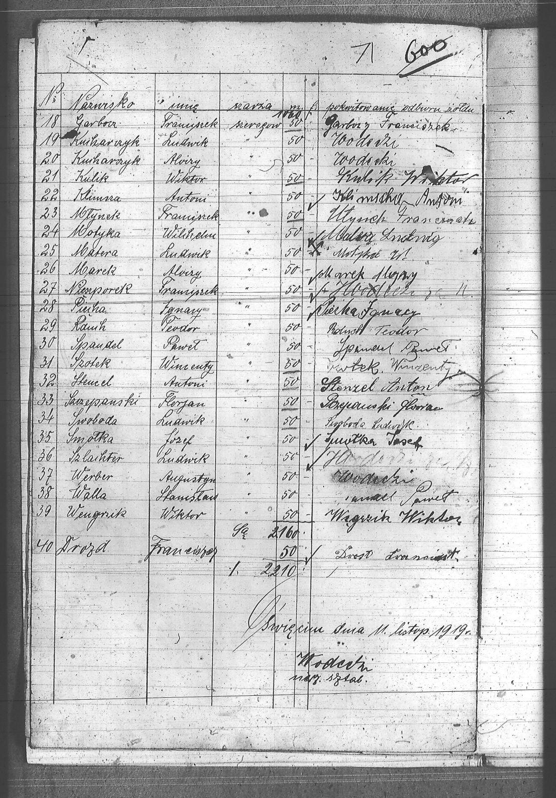 Bauerek, Jan; Białecki, Józef; Bochynek, Alojzy; Bytomski, Paweł; Ciemienga, Sylwester; Czarnecki, Wincenty; Drozd, Franciszek; Garbocz, Franciszek; Garbocz, Fryderyk; Garbocz, Wilhelm; Greger, Karol; Gruszka, Henryk; Klimsza, Antoni; Kowalski, Edward; Kucharczyk, Alojzy; Kucharczyk, Ludwik; Kulik, Wiktor; Marek, Alojzy; Matera, Ludwik; Młynek, Franciszek; Mura, Wilhelm; Nieszporek, Franciszek; Oczadły, Pawel; Pander, Ignacy; Piecha, Ignacy; Rduch, Franciszek; Rduch, Teodor; Smołka, Józef; Spandel, Paweł; Stencel, Antoni; Swoboda, Ludwik; Szczepanski, Florian; Szlachter, Ludwik; Szotek, Wincenty; Szymera, Emil; Walla, Stanisław; Wengrzik, Wiktor; Werber, Augustyn; Wodecki, Jan; |